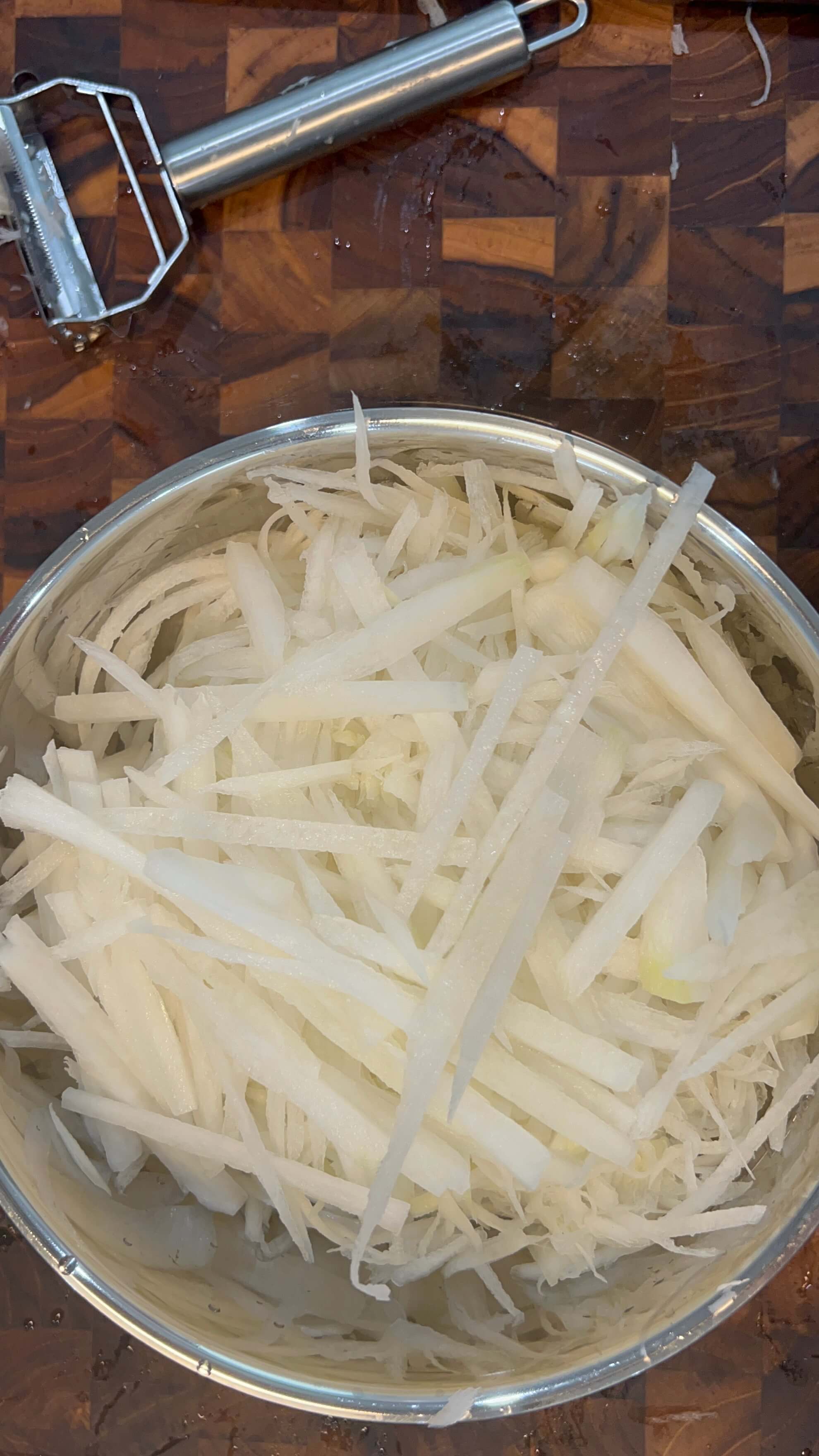 2. 씻은 무는 이렇게 채를 썰어줍니다.