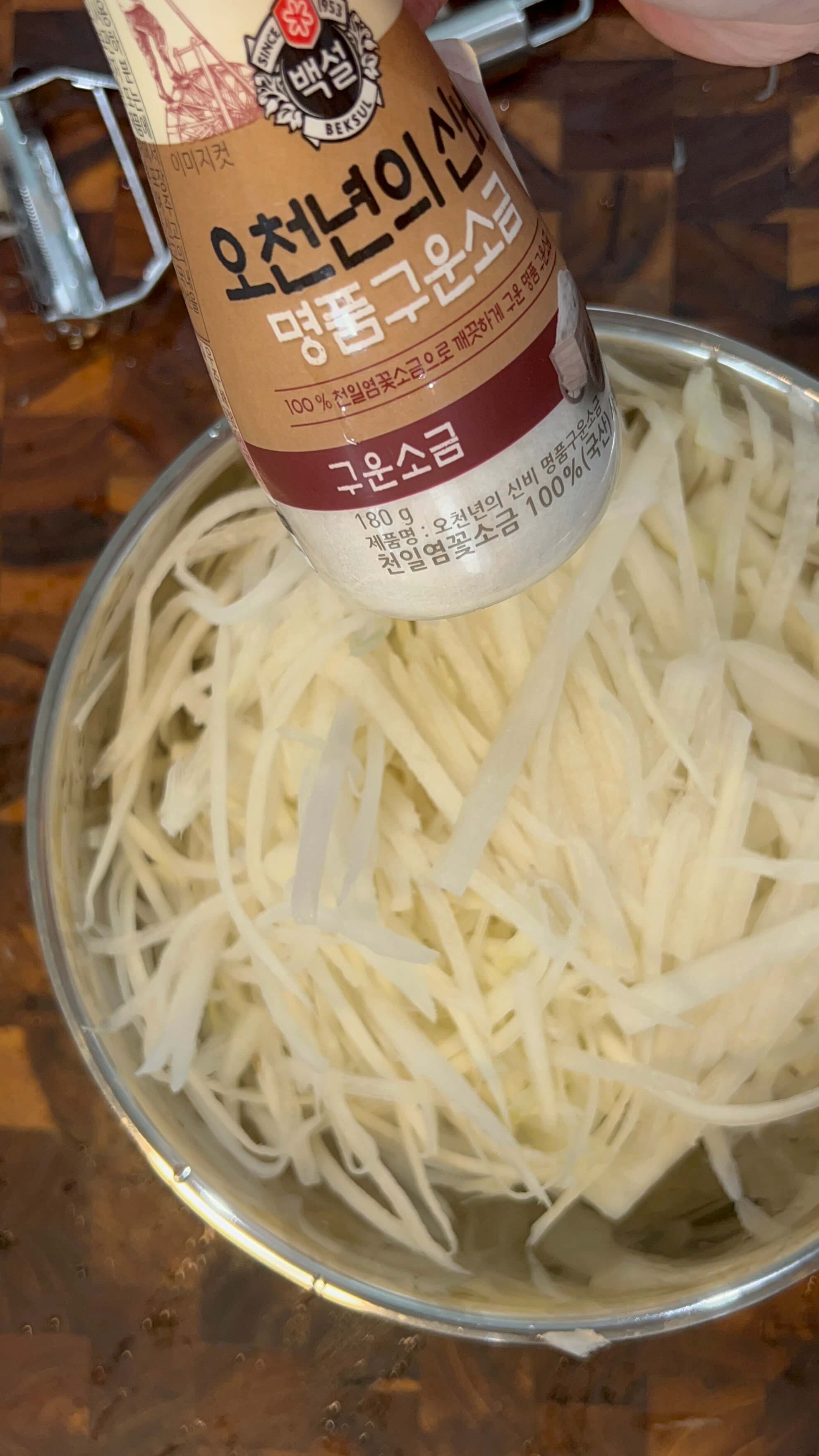 3. 채 썬 무는 소금을 넣고 잘 버무려서 한 30분간 절여줍니다.