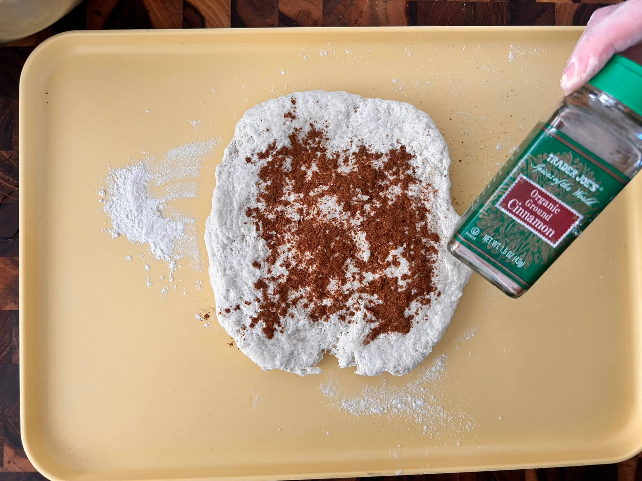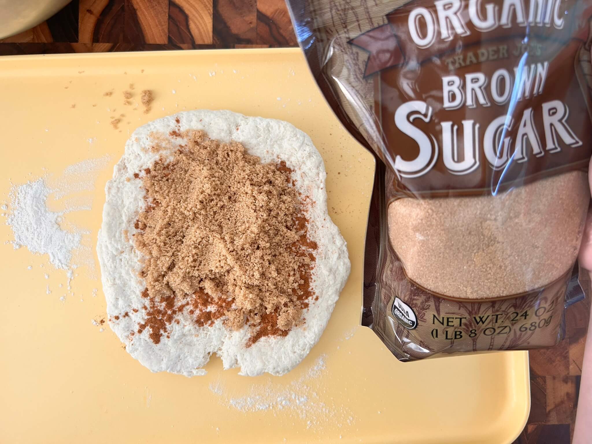 4. 반죽을 좀 밀어준 뒤에 시나몬가루와 황설탕을 넣어줍니다.