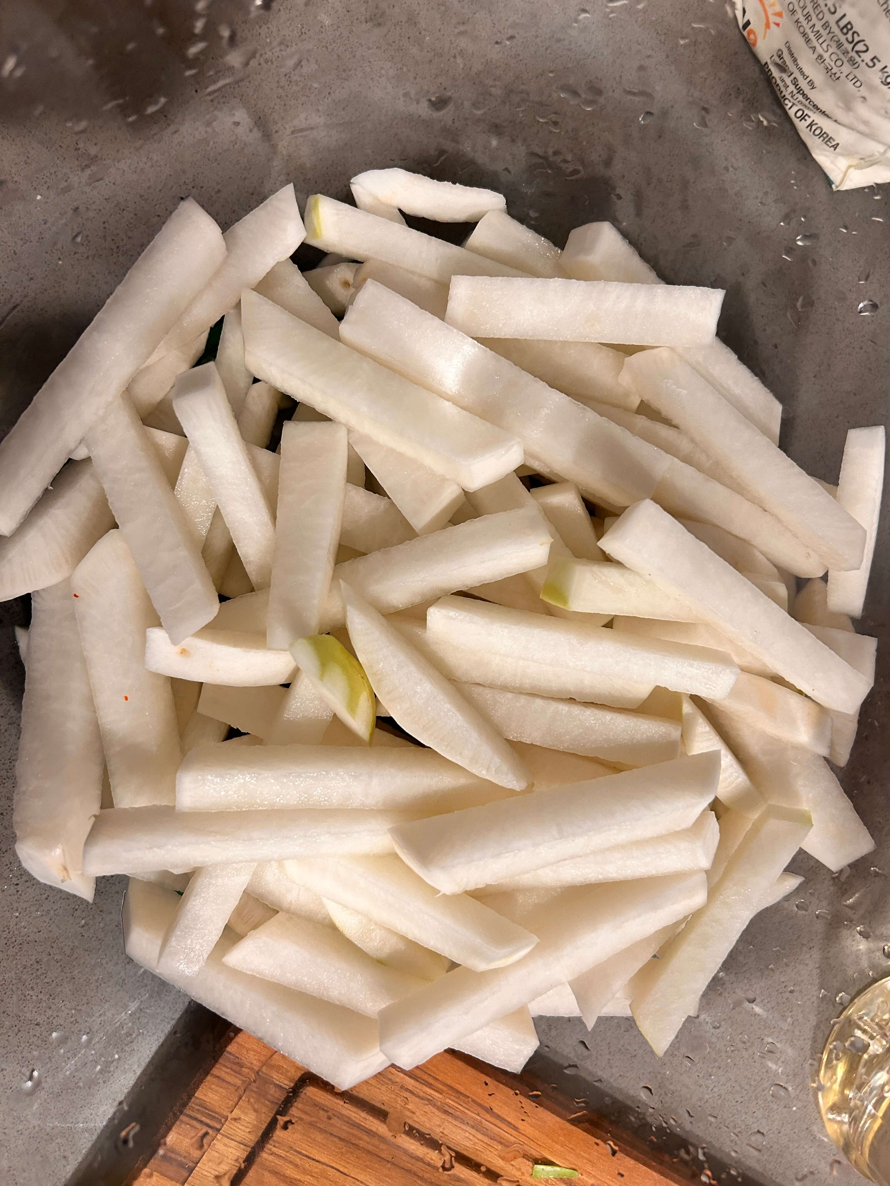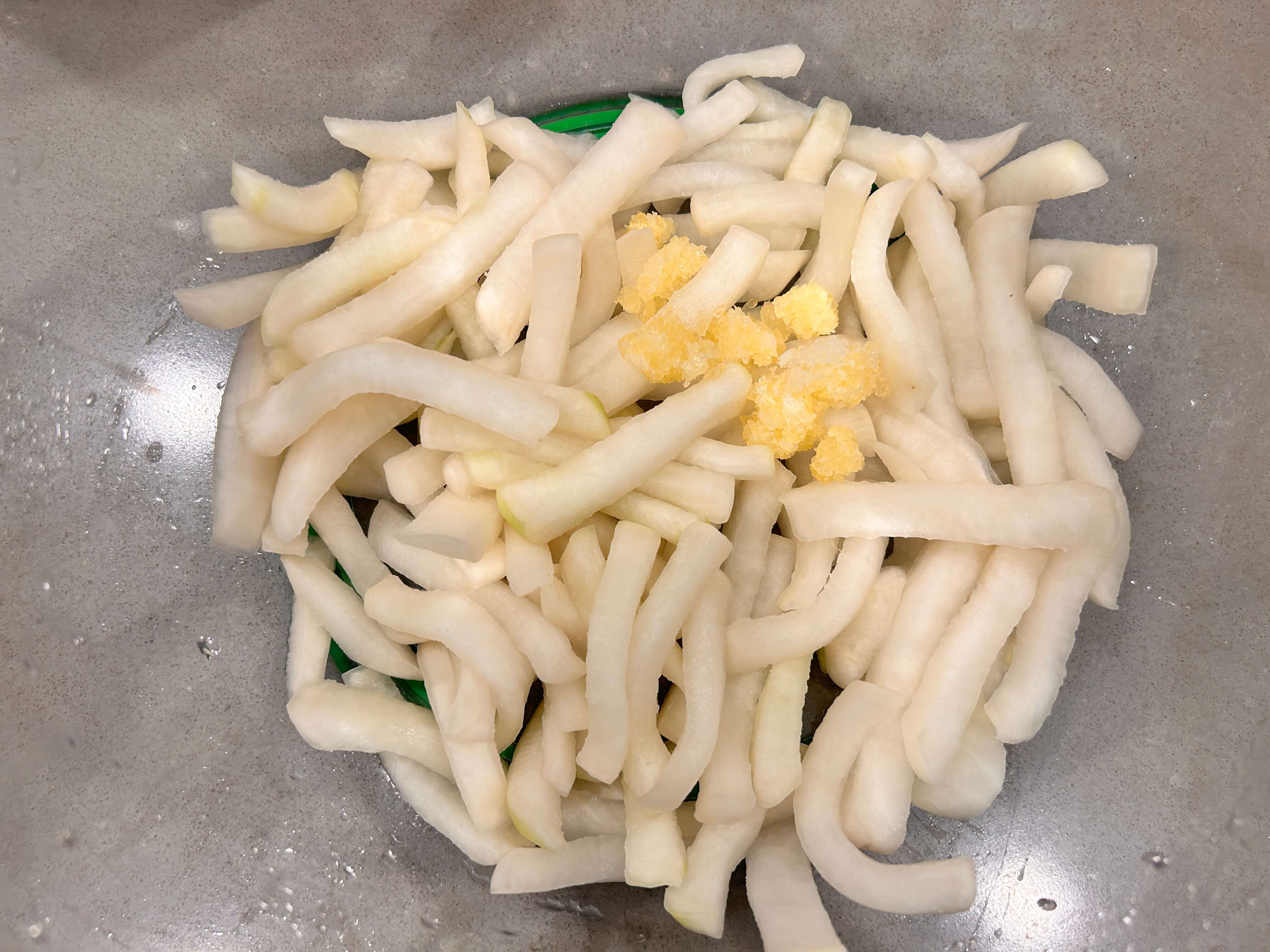 2. 썰은 무를 볼에 담고, 물엿과 소금을 넣고 절여줍니다.