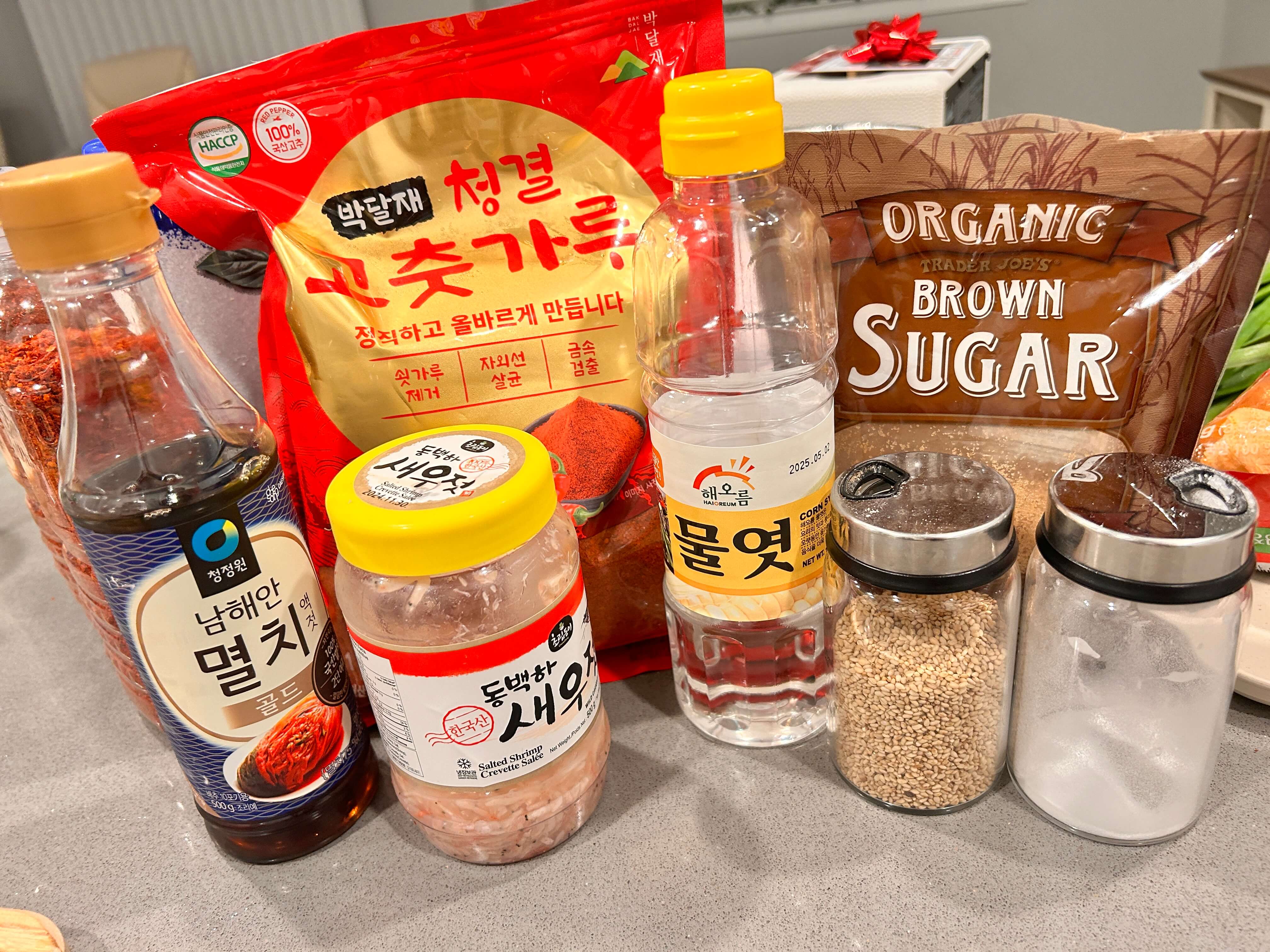 5. 양념재료들을 준비해 줍니다. (다진 마늘, 고춧가루, 멸치액젓, 새우젓, 물엿, 설탕, 깨)