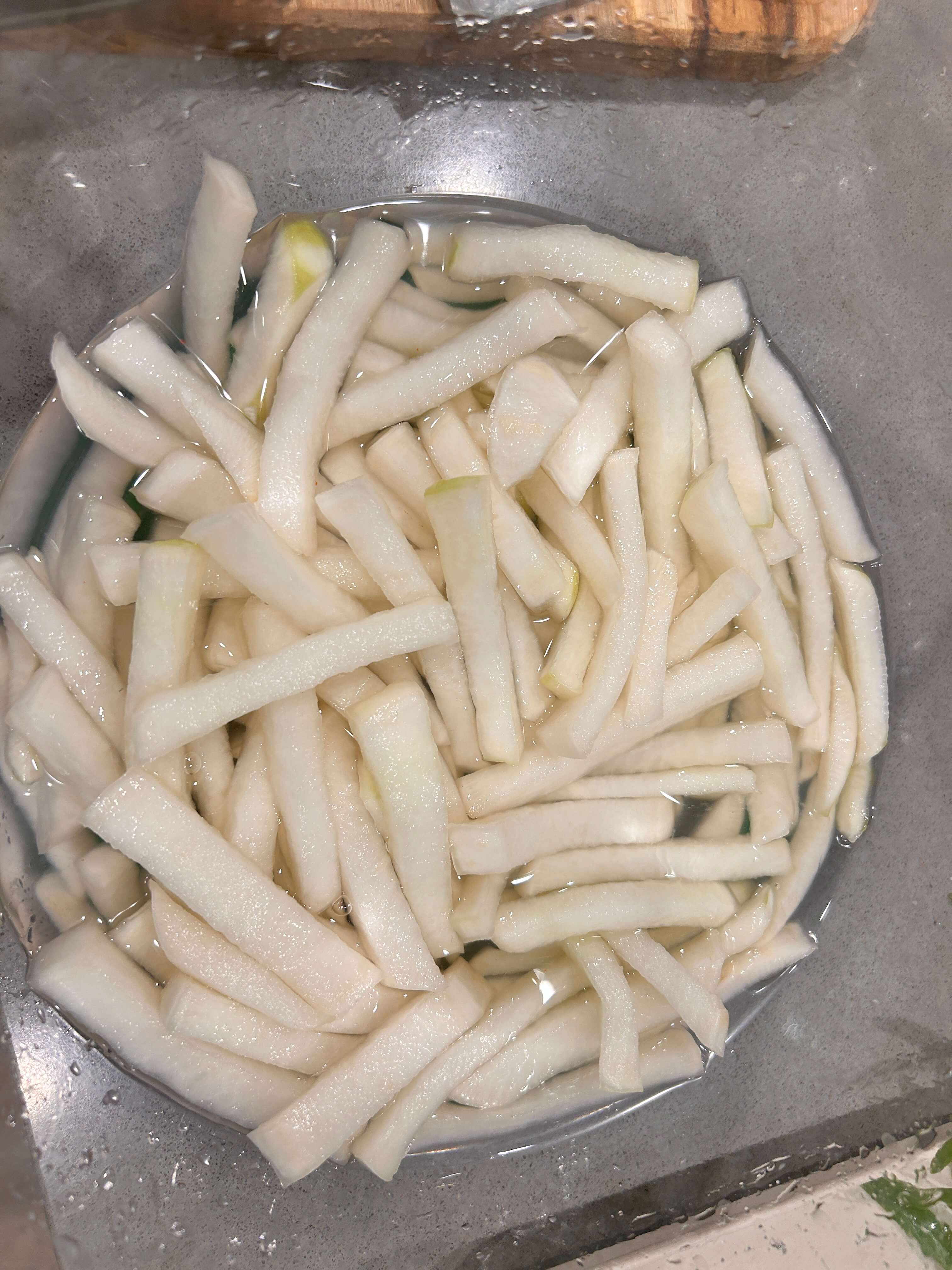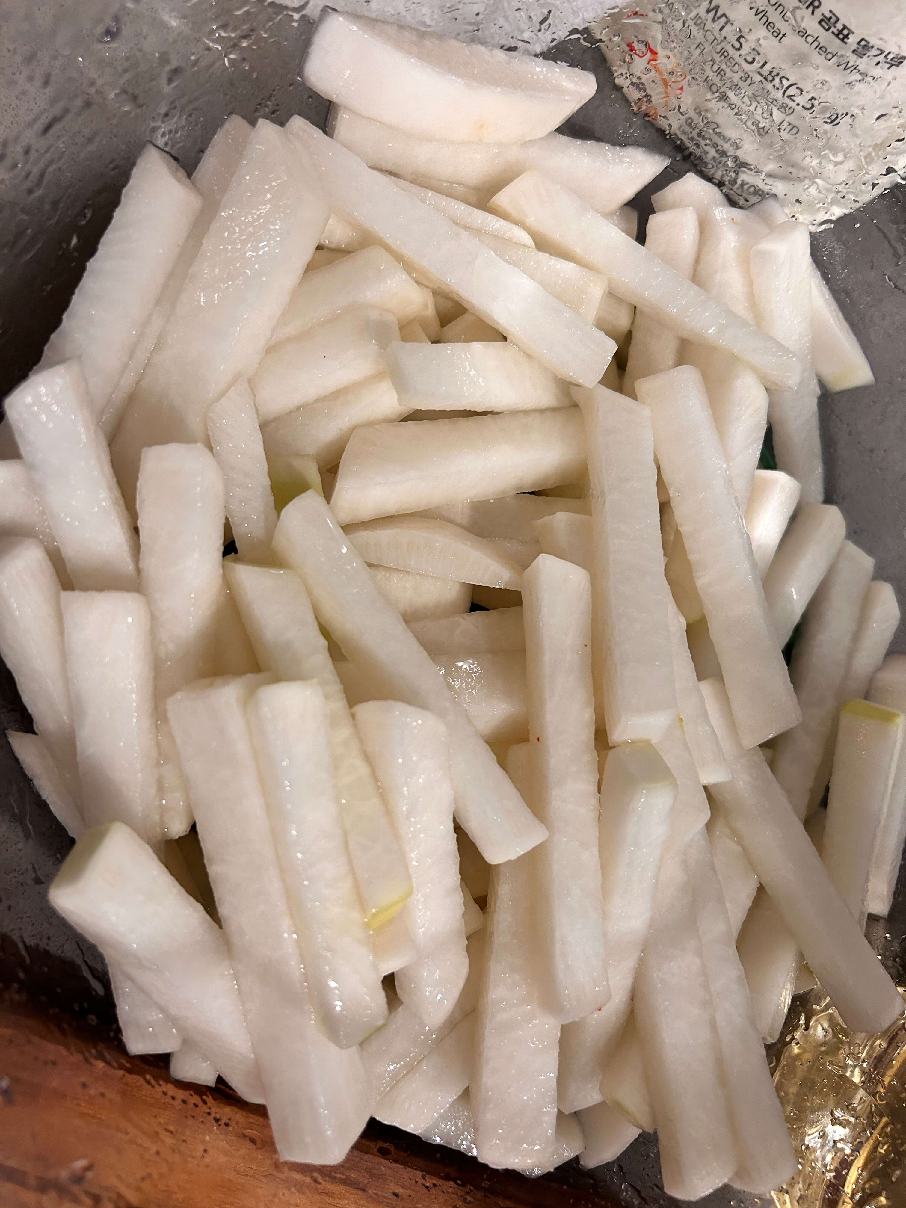 절이는 시간은 그냥 해두시고 다른 거 하시다가 생각나실 때 무의 유연성을 한번 테스트해주시고, 무가 쉽게 구부려질 때까지 놔두시면 좋습니다.