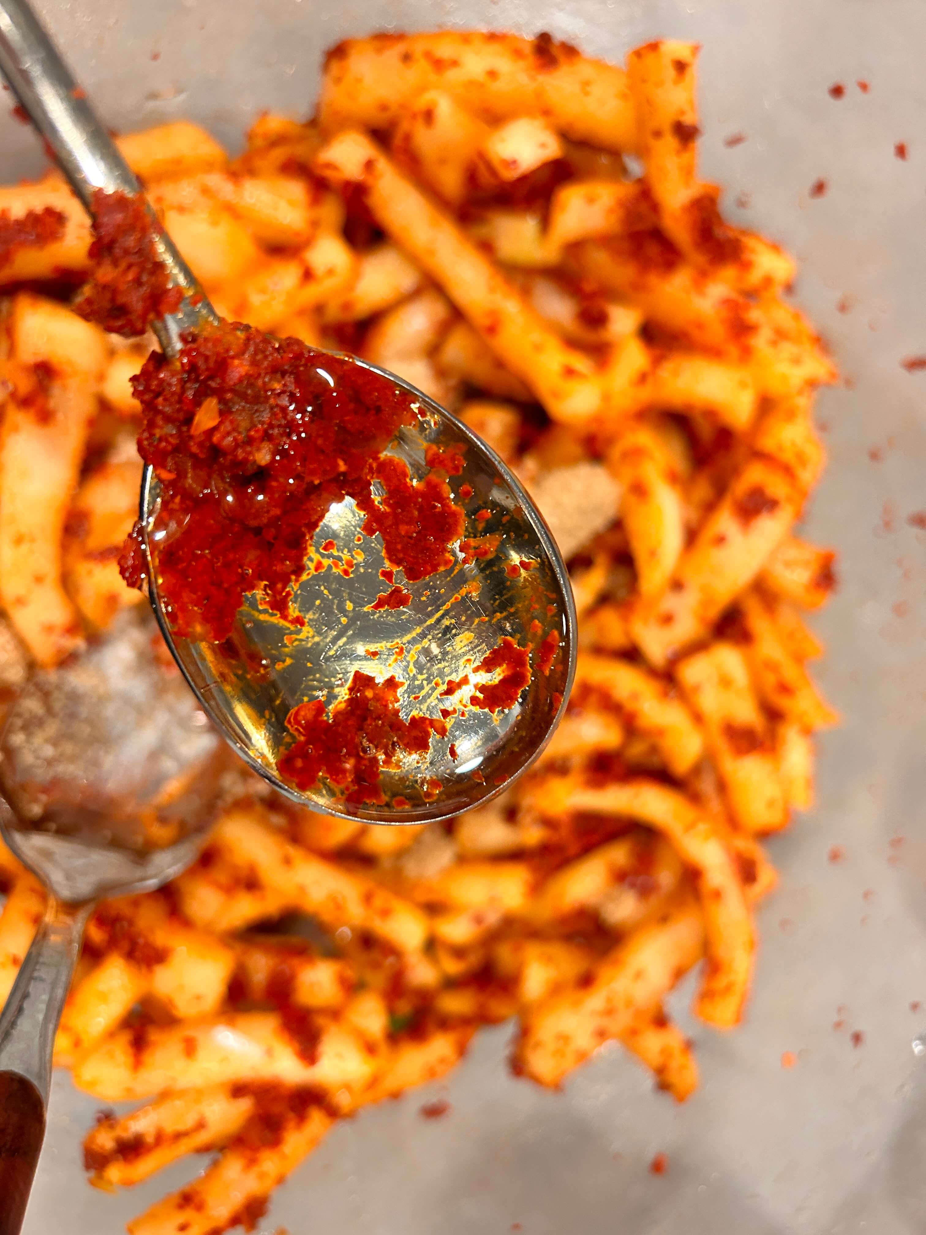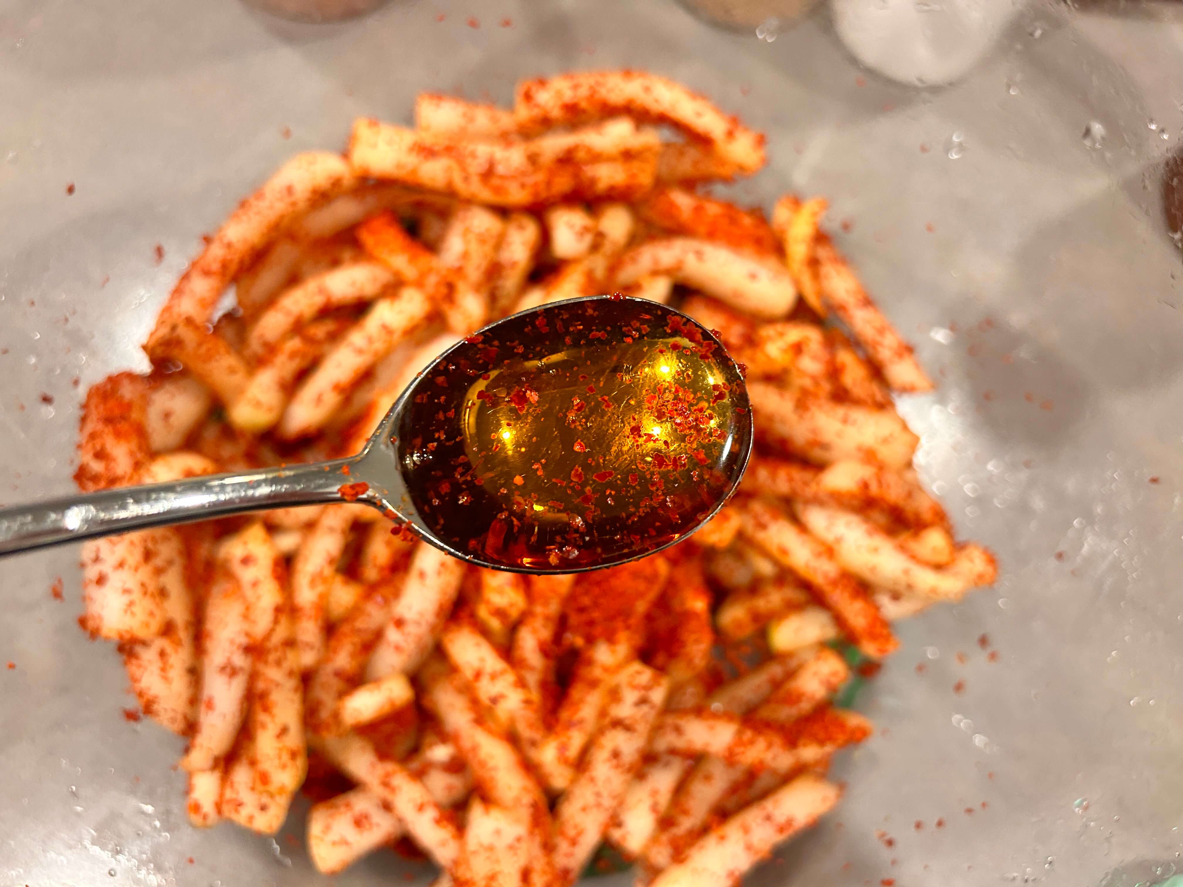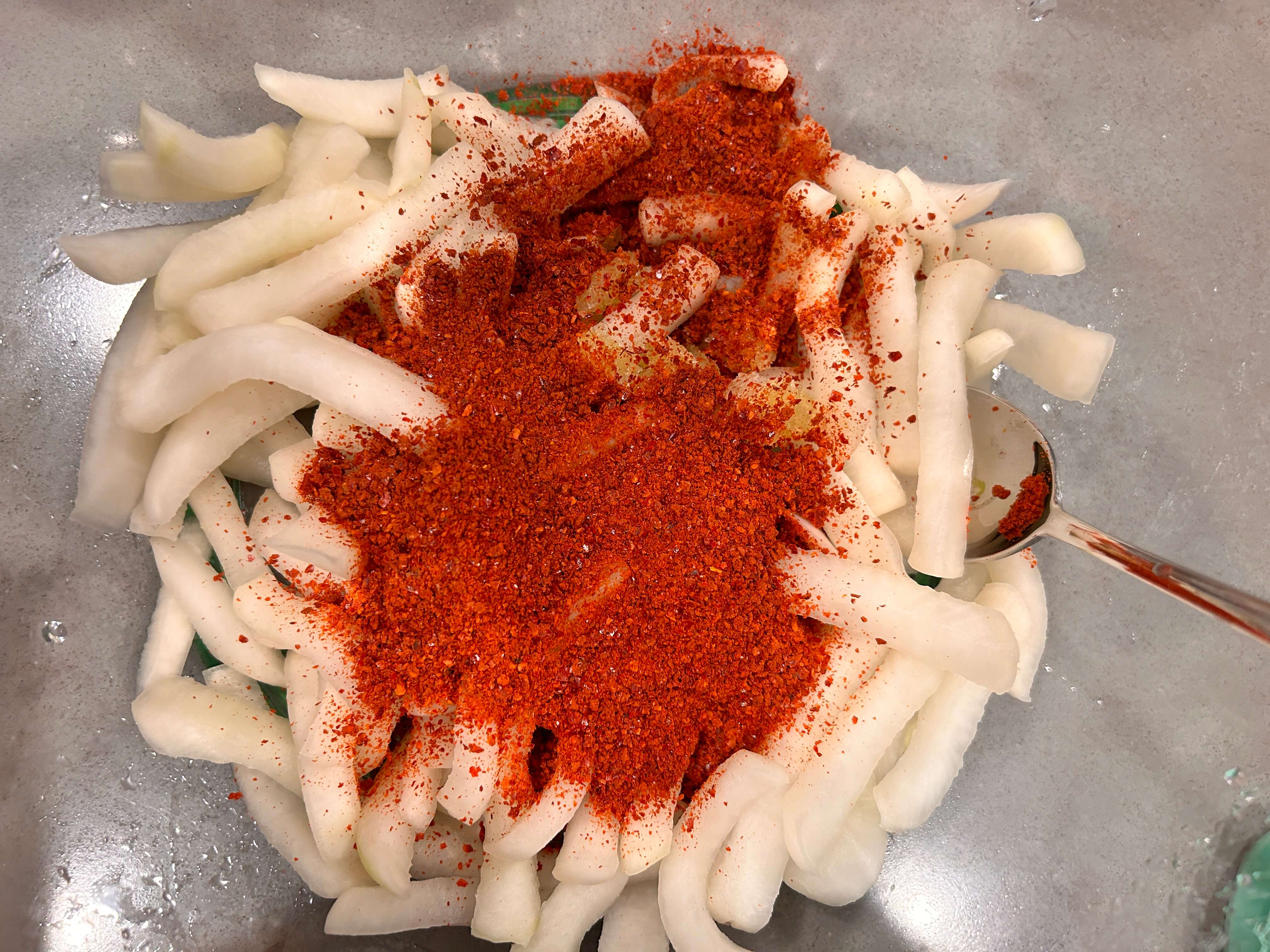 6. 절인무에 다진 마늘(1) , 고춧가루(6)를 넣어줍니다.