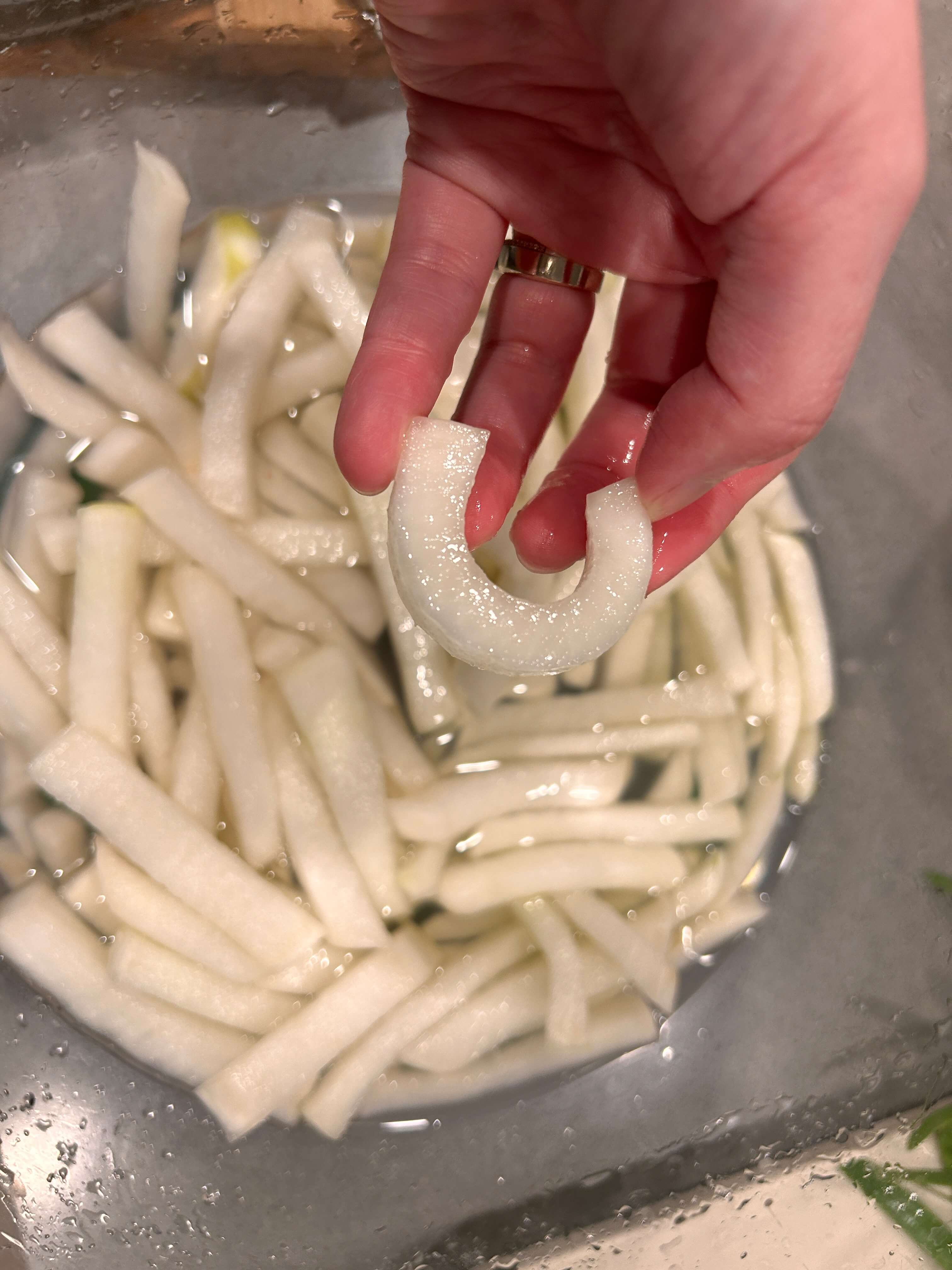 3. 절이는 시간은 사진에 보이는 것처럼 무가 휘어질 때까지 절여주시면 됩니다.