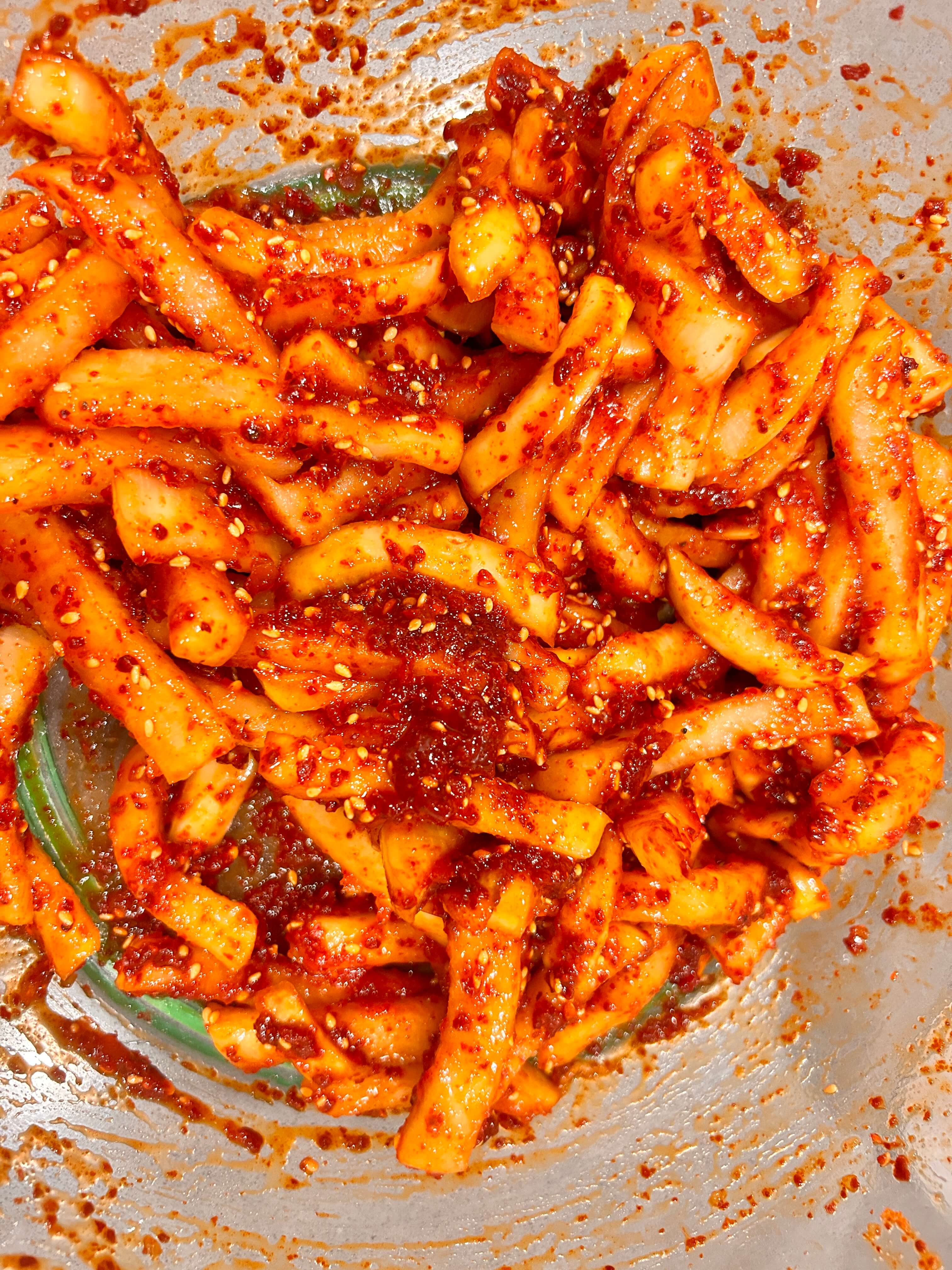 6. 절인무에 다진 마늘(1) , 고춧가루(6)를 넣어줍니다.