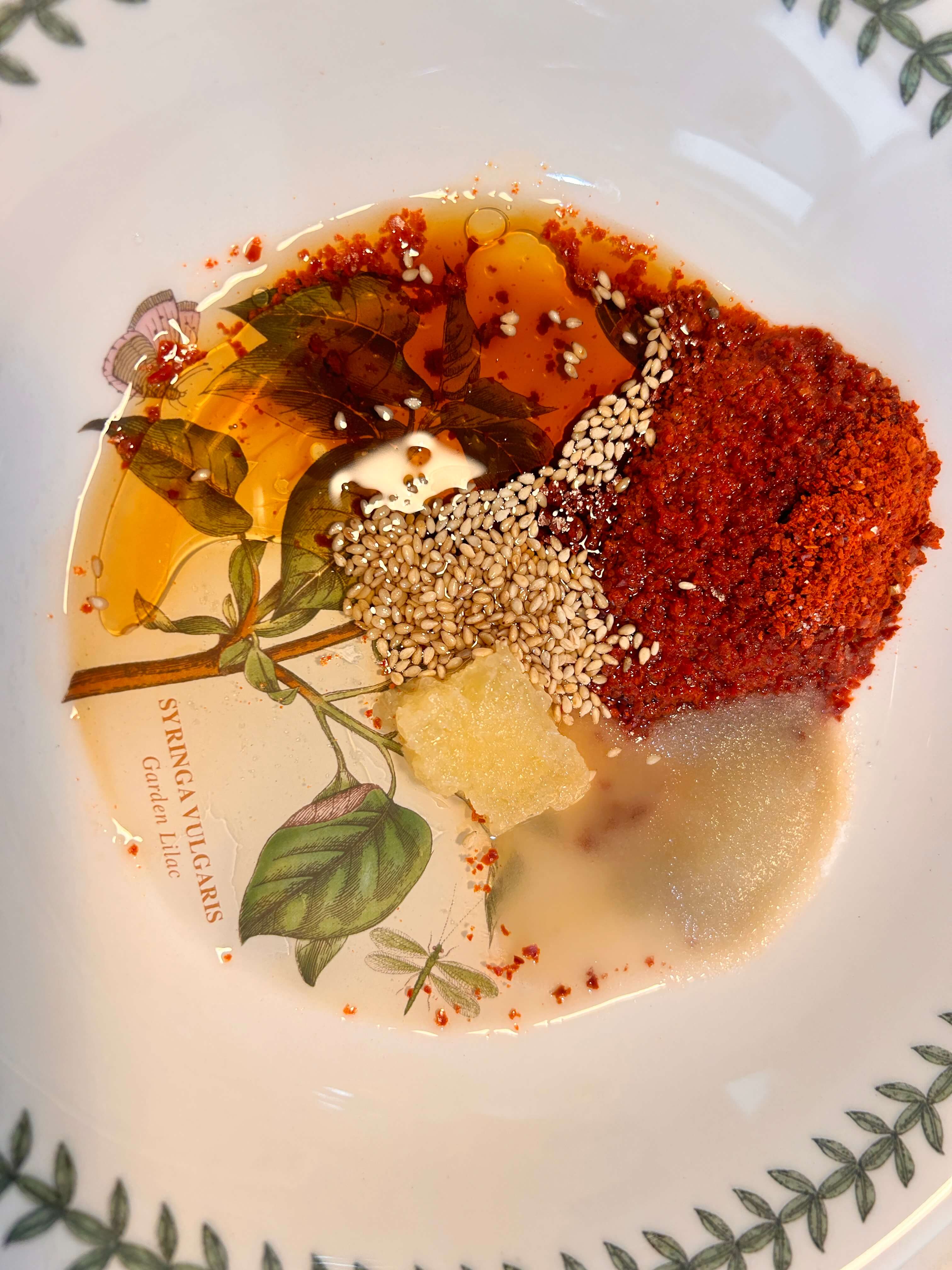 3. 소스들을 준비해 줍니다. (다진마늘, 깨, 간장, 식초, 설탕, 물엿, 고춧가루, 참기름)