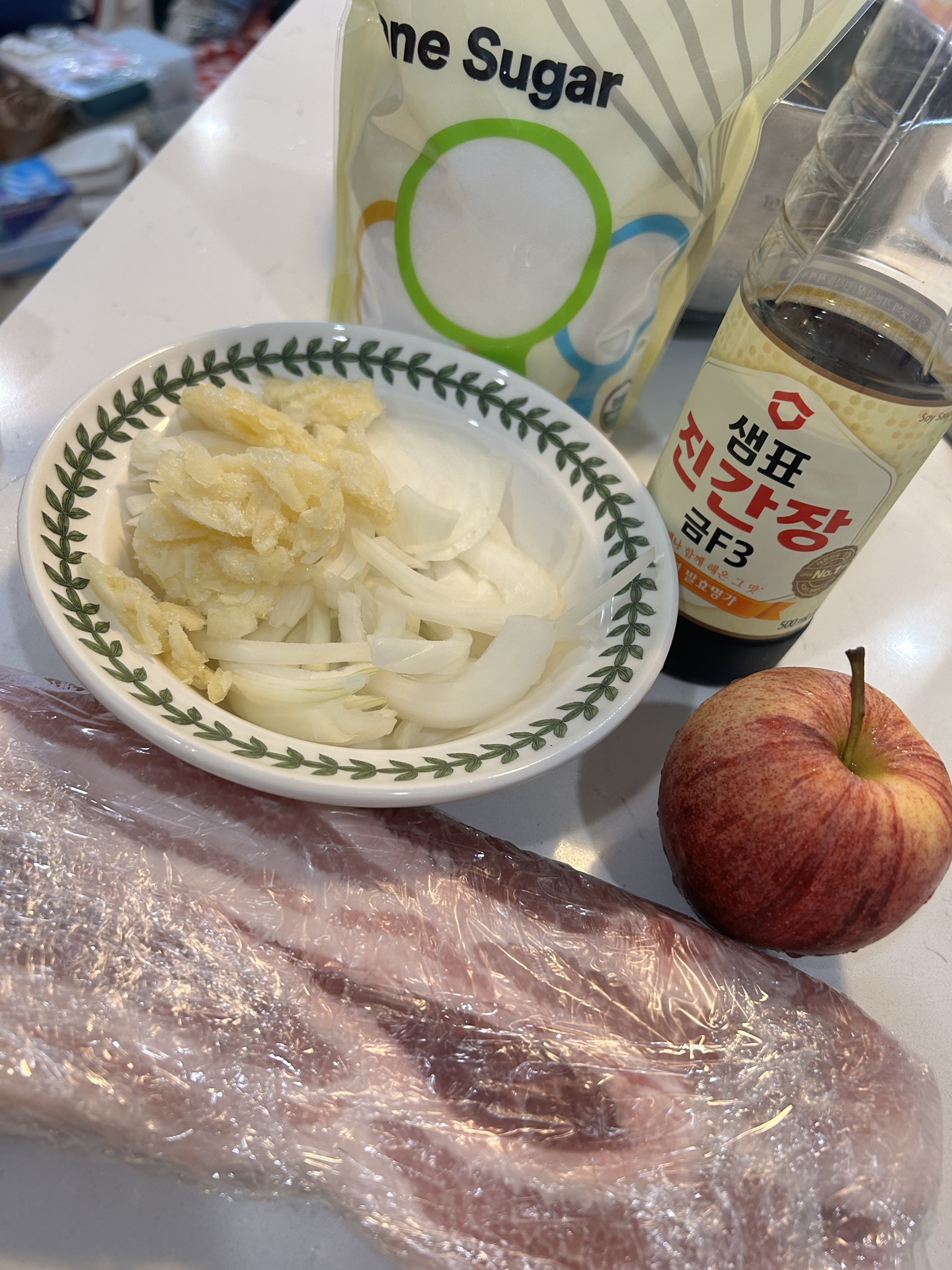 삼겹살 수육 재료 삼겹살 (pork belly) 된장 후추 시나몬가루 고춧가루 양파 마늘 사과 레시피 1. 육수낼 재료를 준비한다. (된장, 후추, 고춧가루, 시나몬가루, 사과, 마늘, 양파) 다음번엔 간장베이