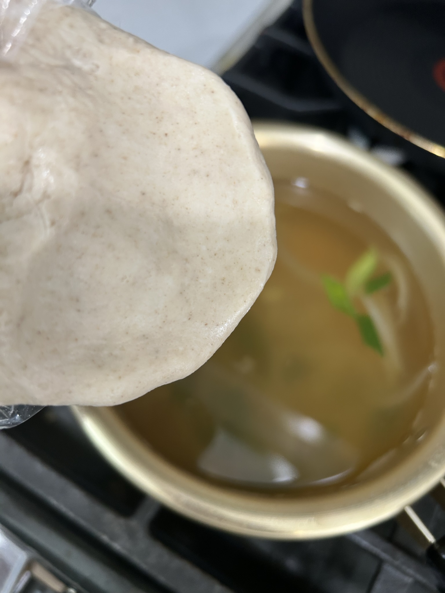4. 육수가 어느 정도 끊으면 아까 준비한 반죽을 가져옵니다.