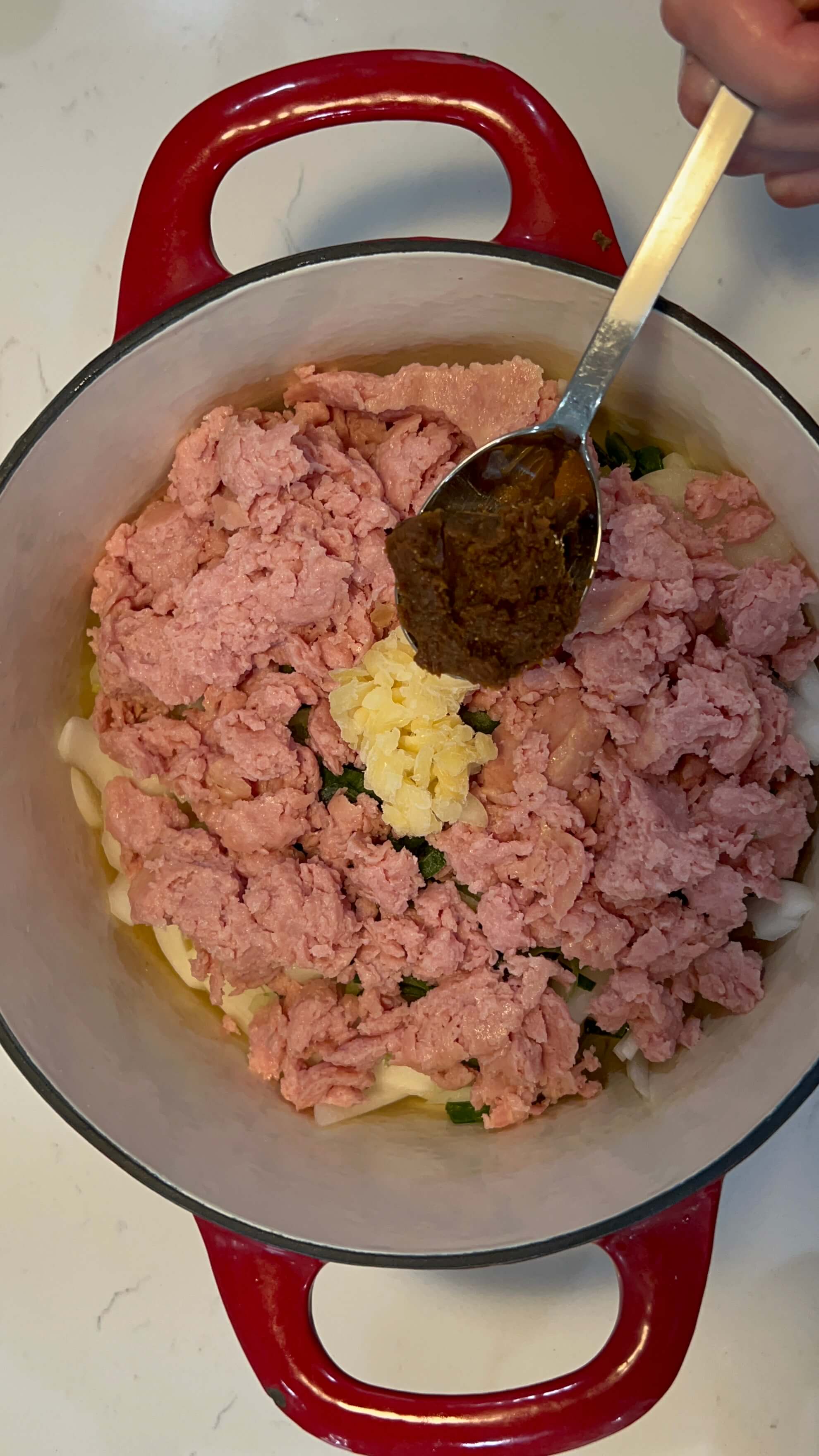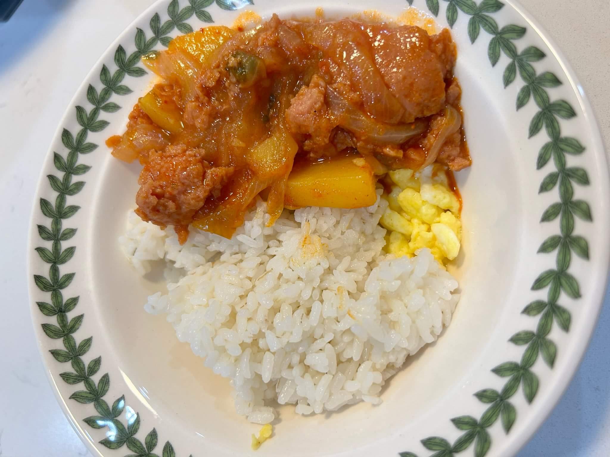 14. 따끈한 밥에 스팸감자짜글이를 올려서 먹으면 완전 꿀맛입니다.