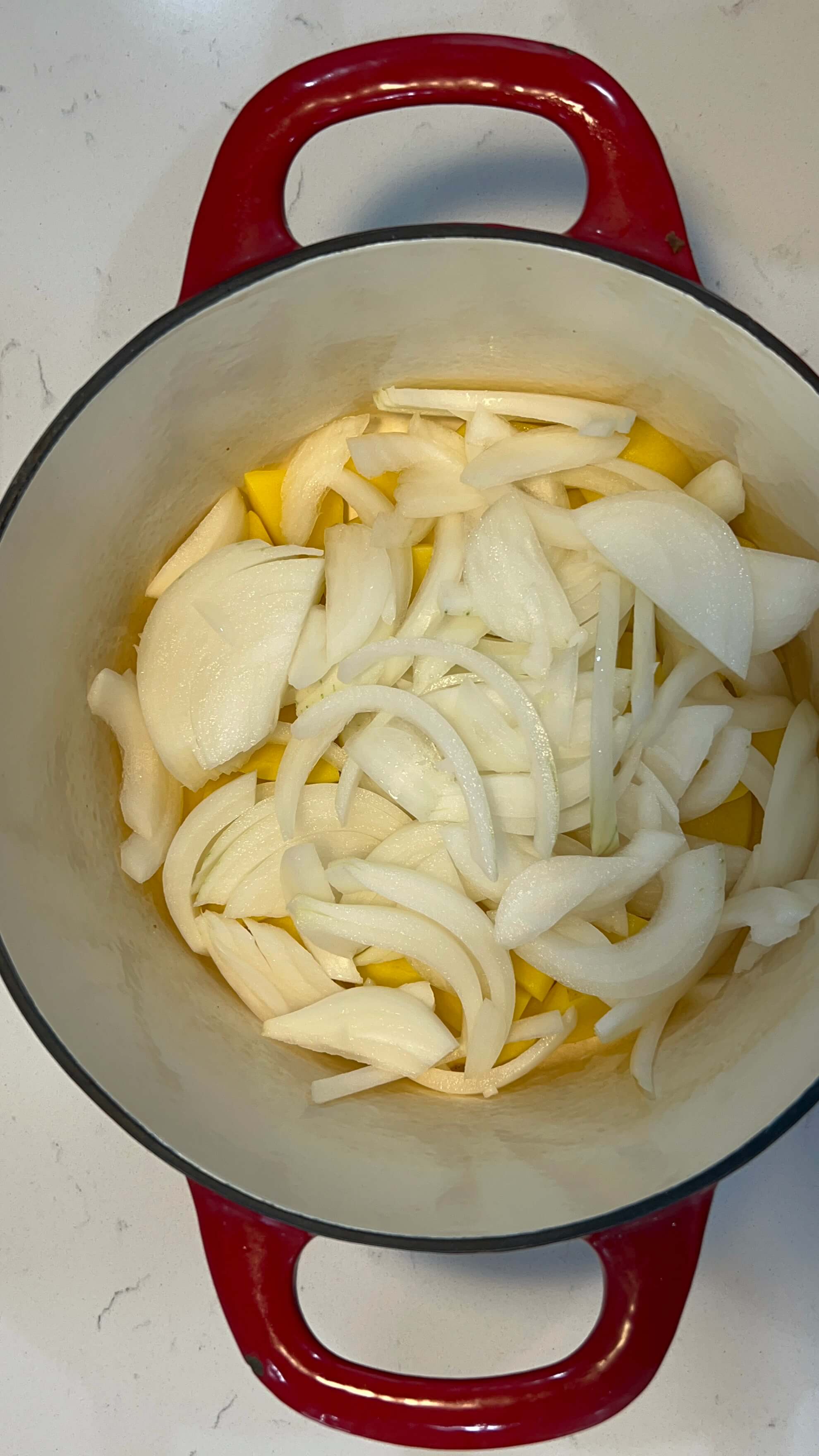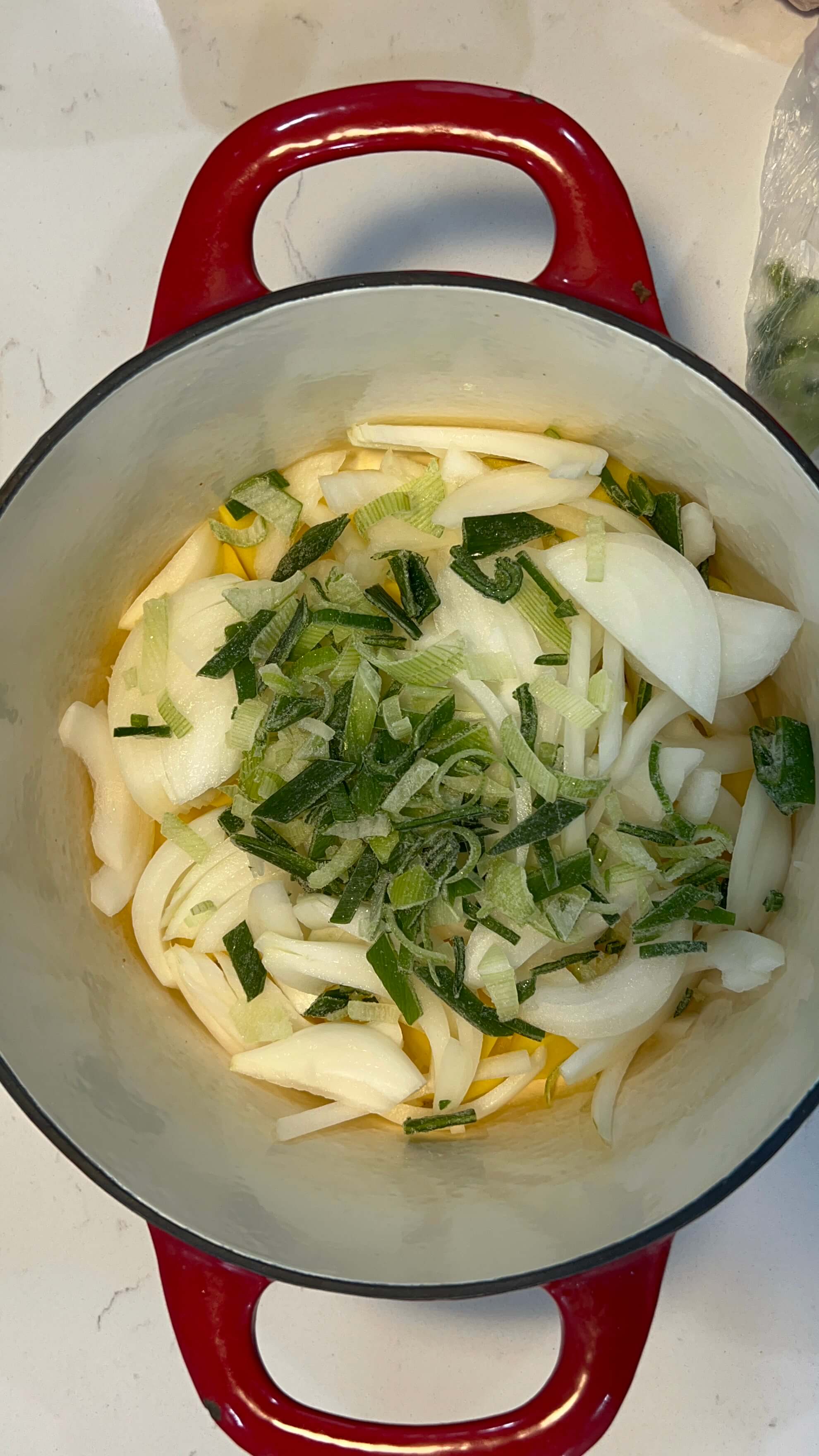 3. 냄비에 감자, 양파, 대파를 차례로 깔아줍니다.