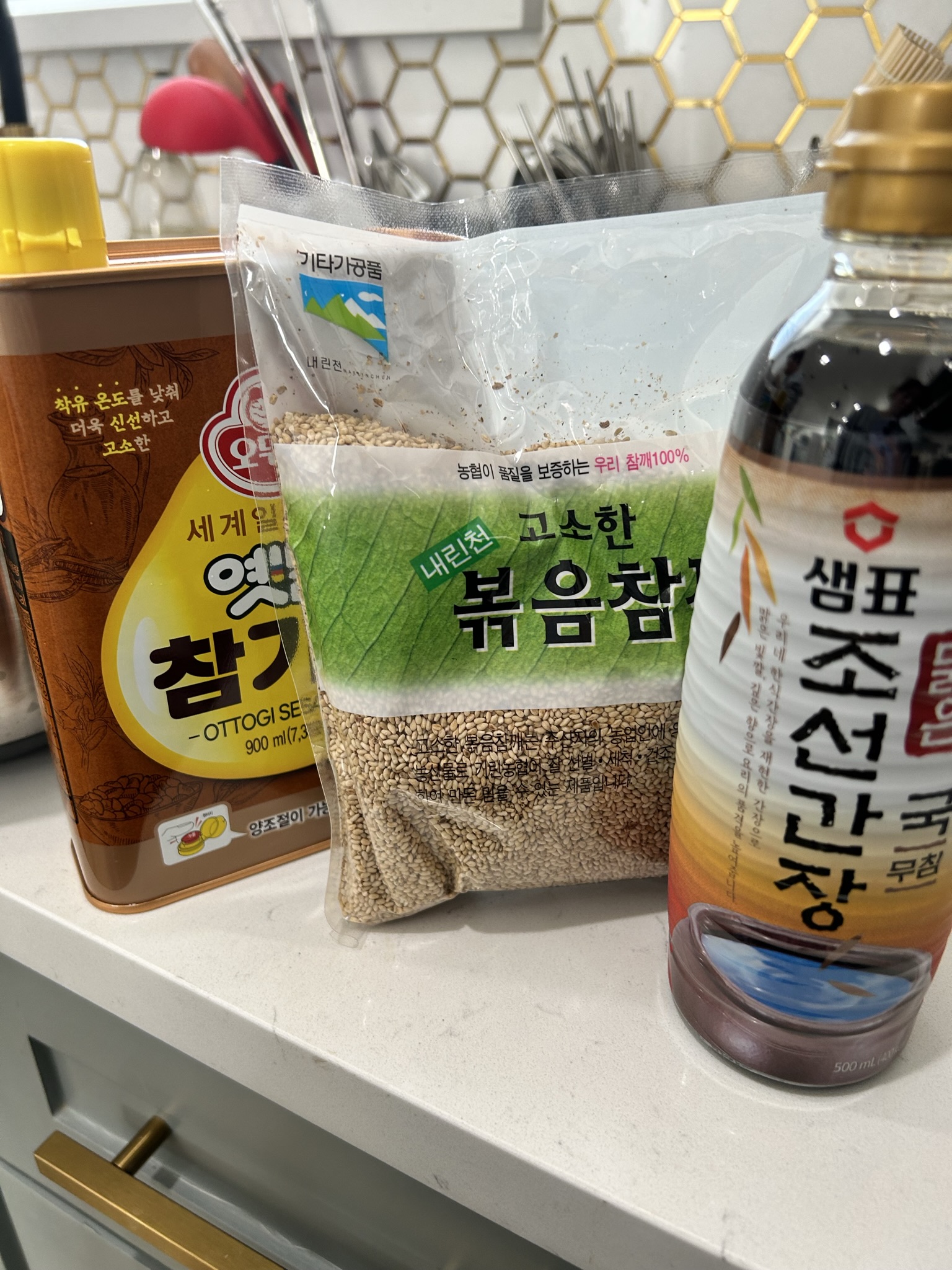 7. 양념재료는 다음과 같이 국간장(간장), 참기름, 참깨로 준비한다.