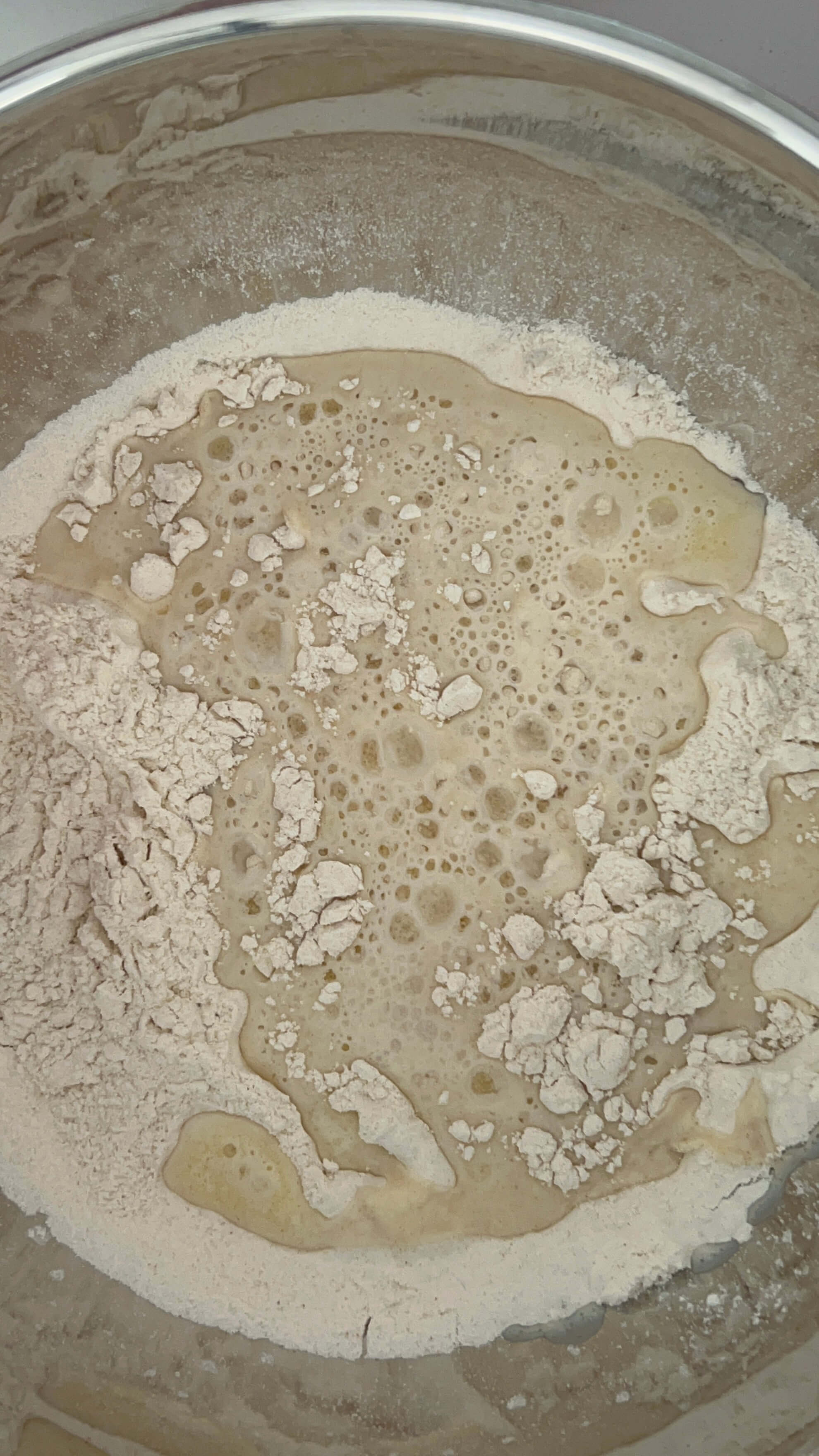 8. 체 친 밀가루에 이스트까지 넣어 준비된 6번 그릇을 넣어줍니다.
