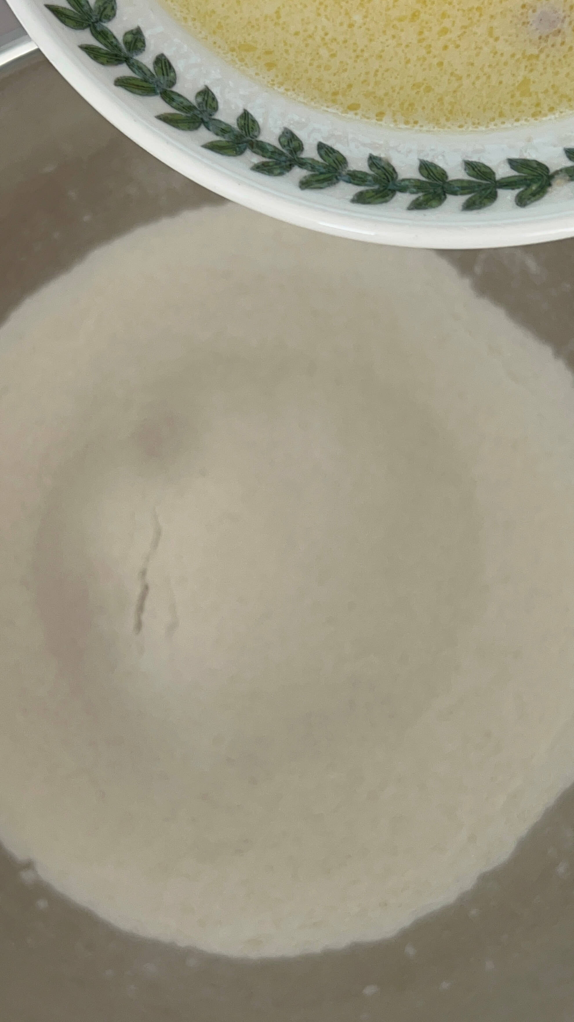 8. 체 친 밀가루에 이스트까지 넣어 준비된 6번 그릇을 넣어줍니다.