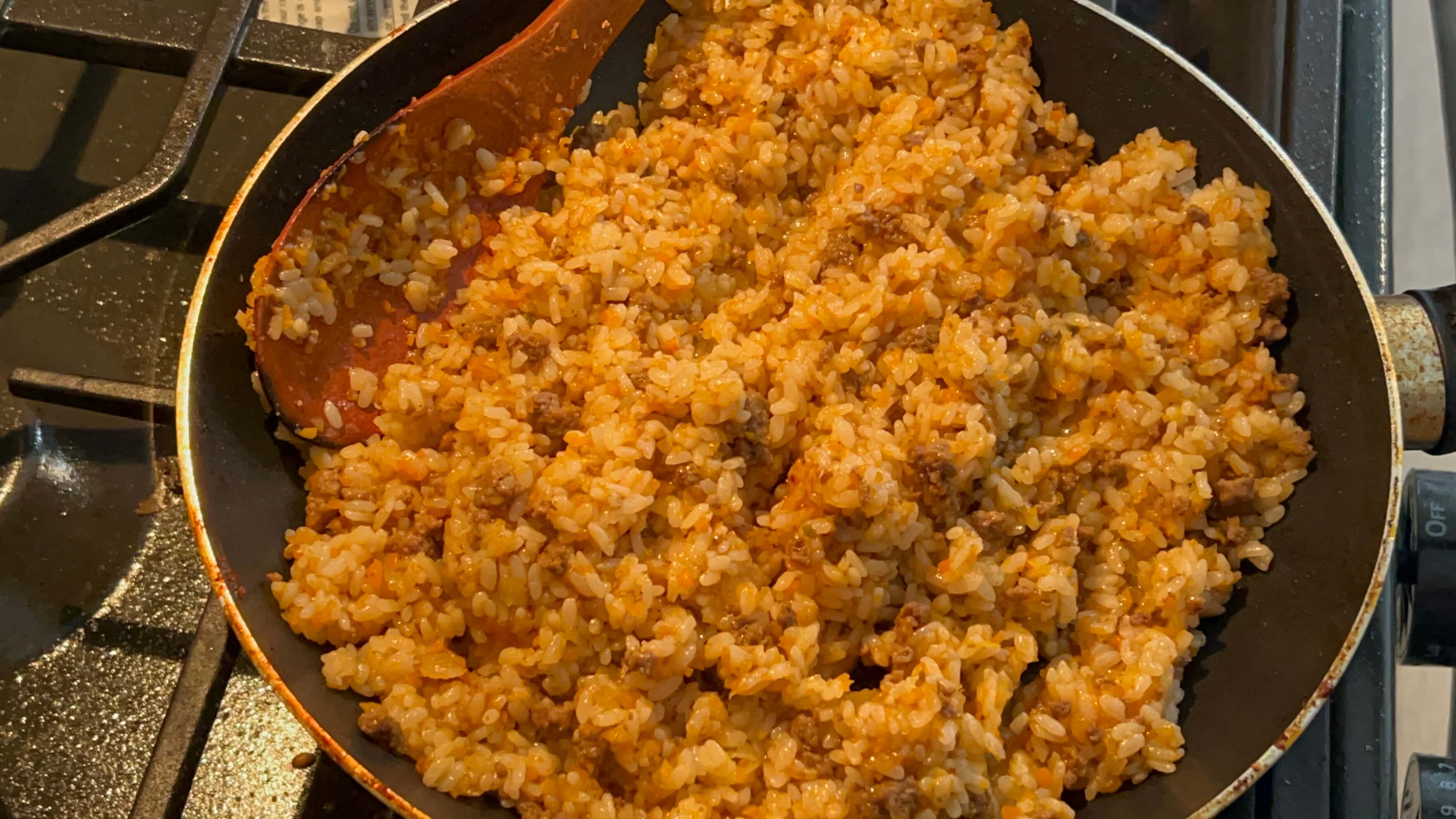 1. 적당량의 밥을 준비해서 양념다짐고기를 넣어 볶아줍니다.