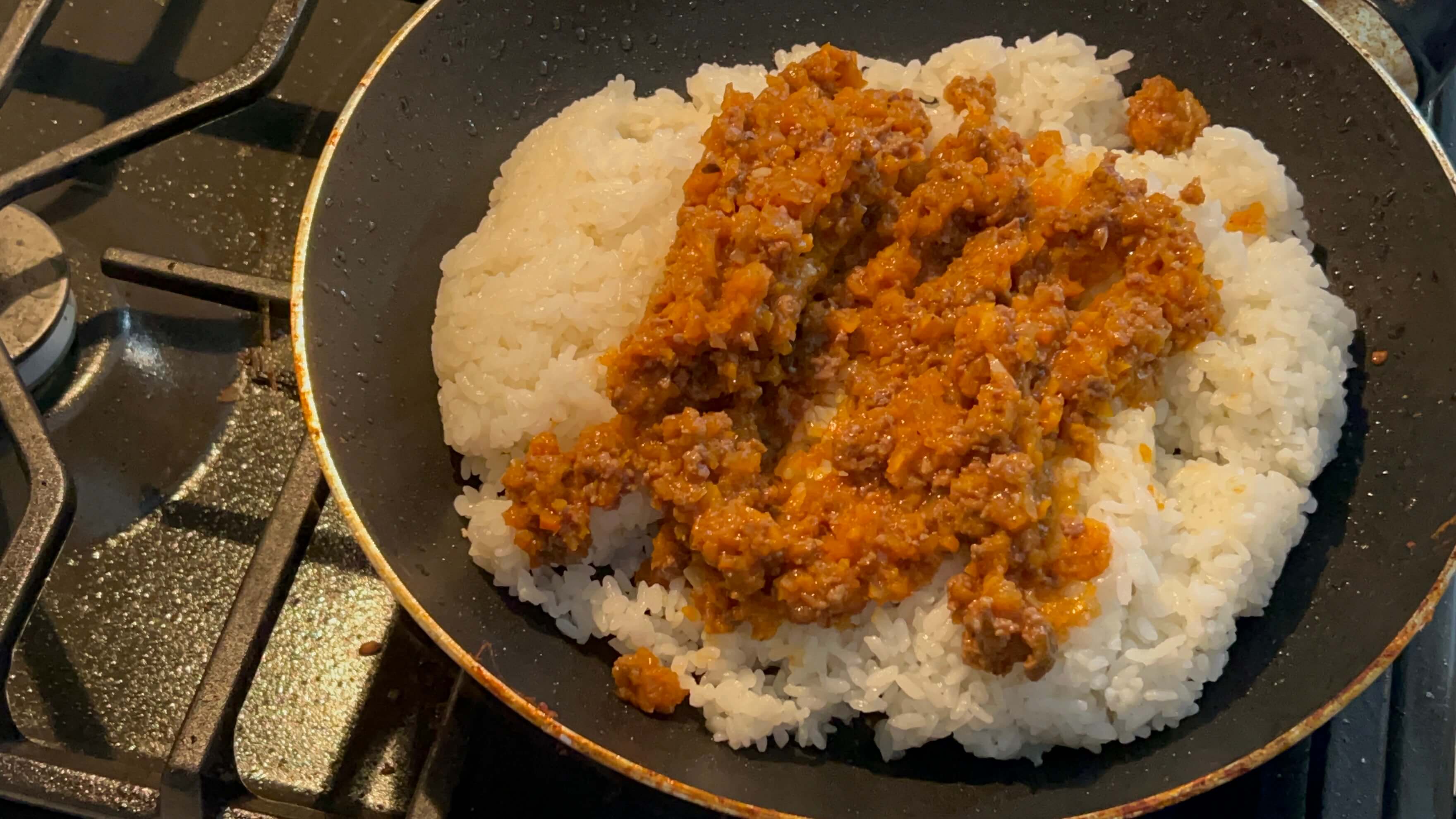 8. 아까 양념다짐고기에 볶아준 밥 위에 이렇게 계란을 올려주시고 준비한 소스를 위에 부어줍니다.