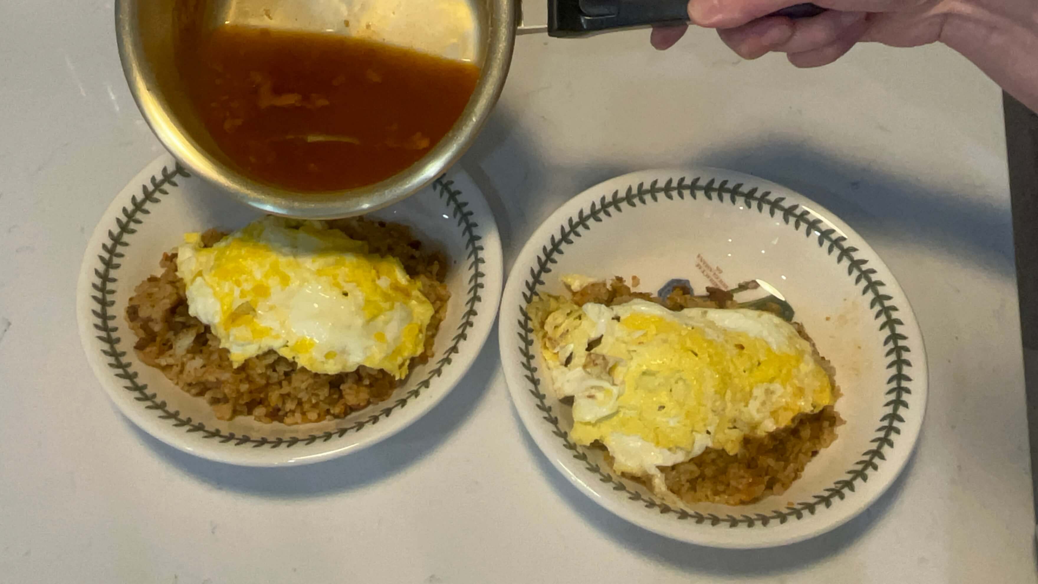 8. 아까 양념다짐고기에 볶아준 밥 위에 이렇게 계란을 올려주시고 준비한 소스를 위에 부어줍니다.