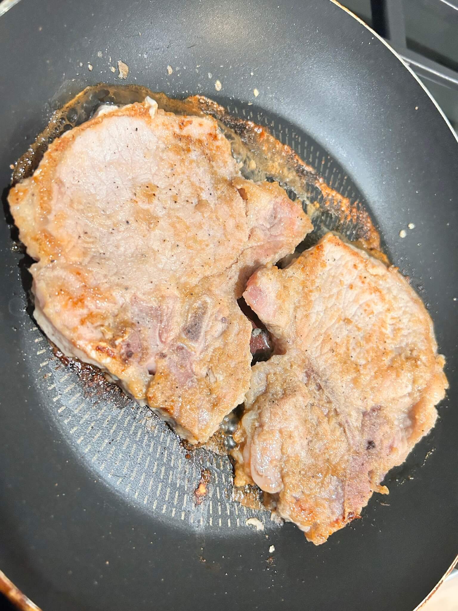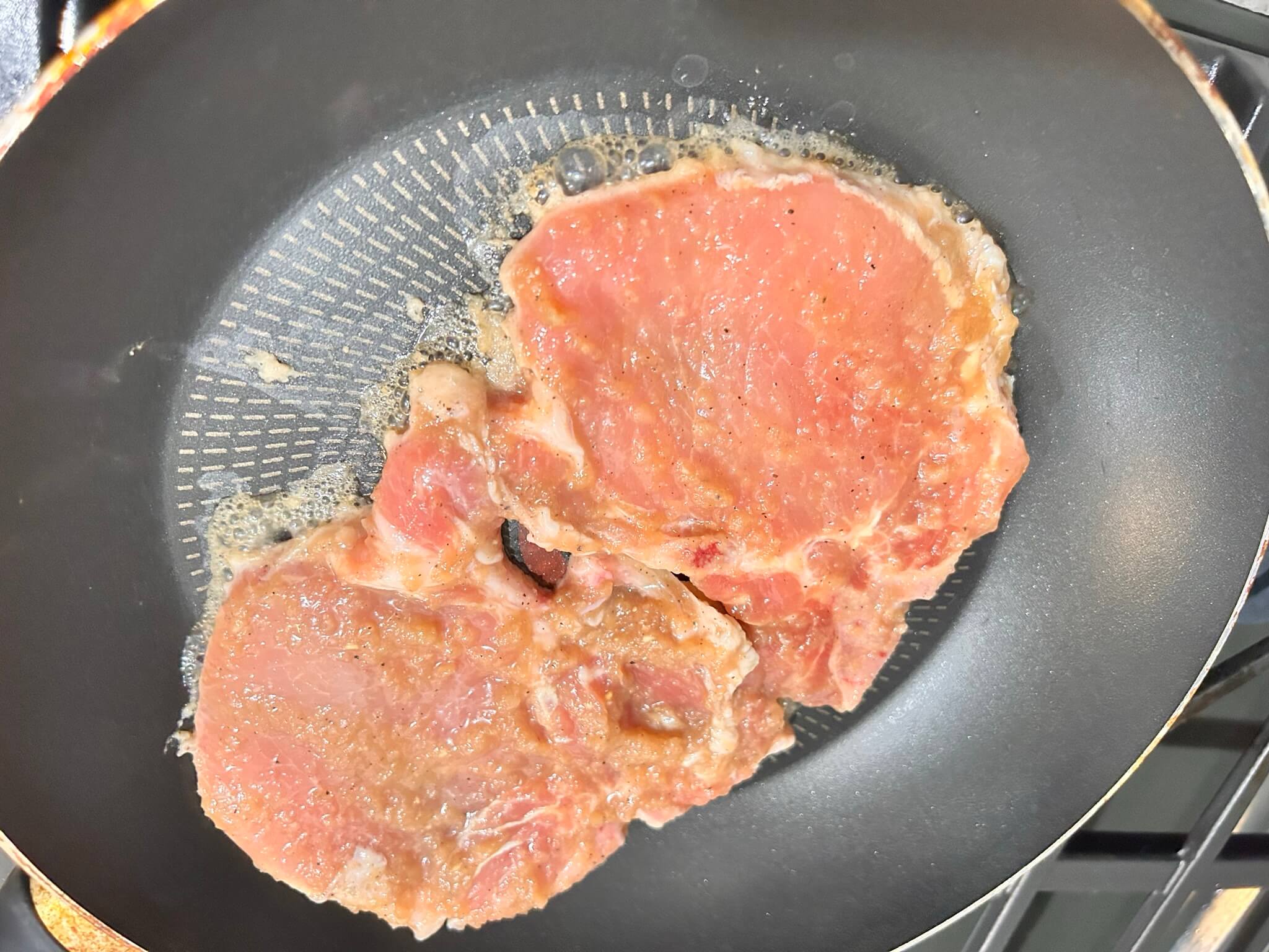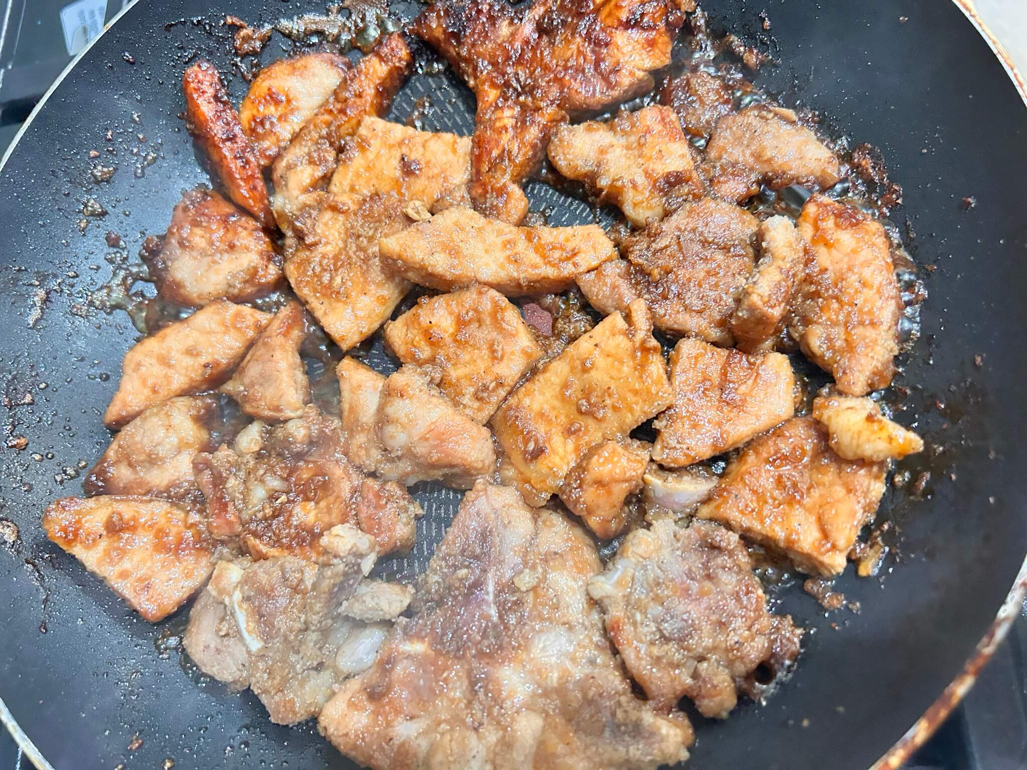 8. 프라이팬에 간이 잘 벤 고기를 올려주고 구워줍니다.