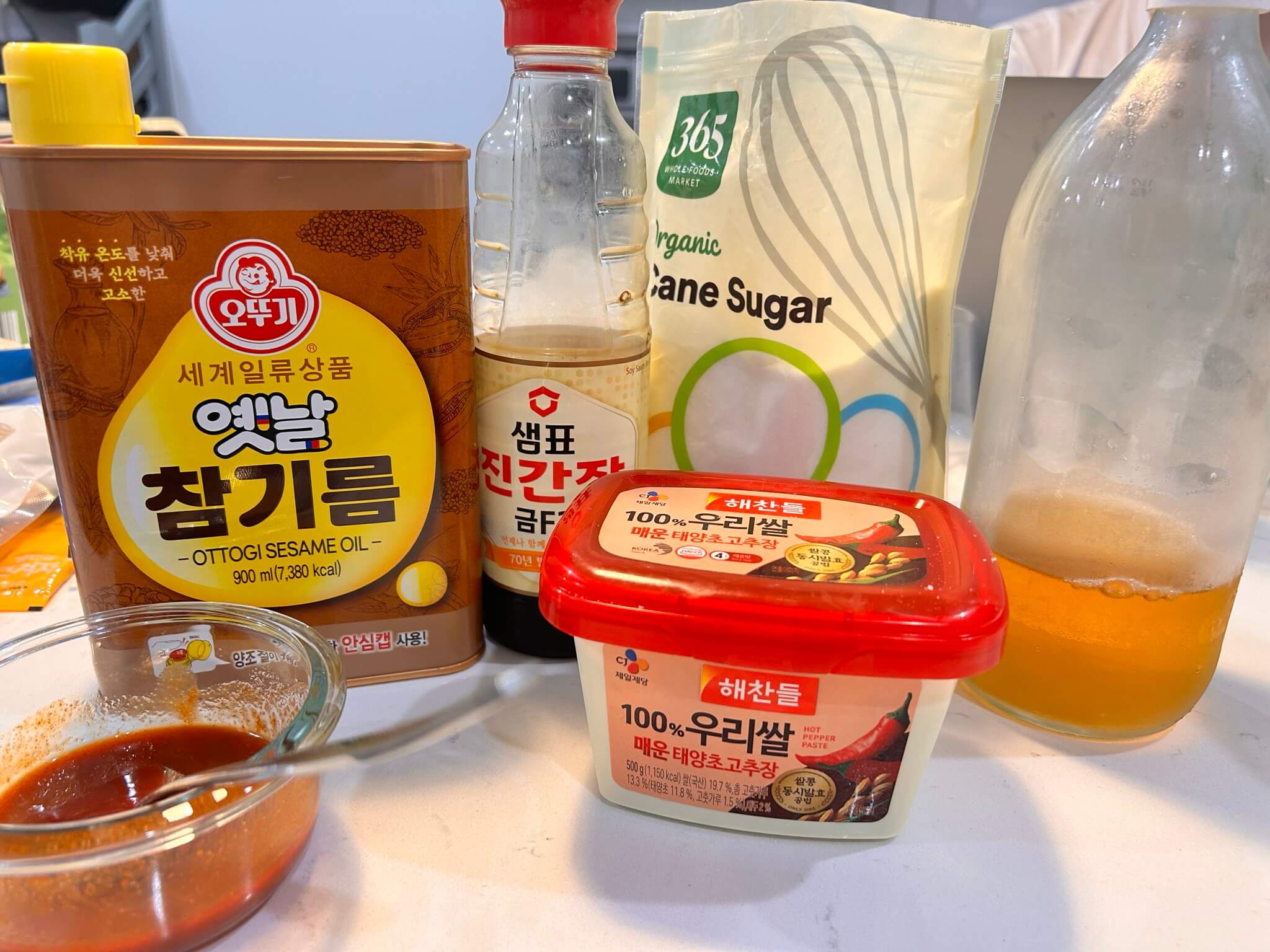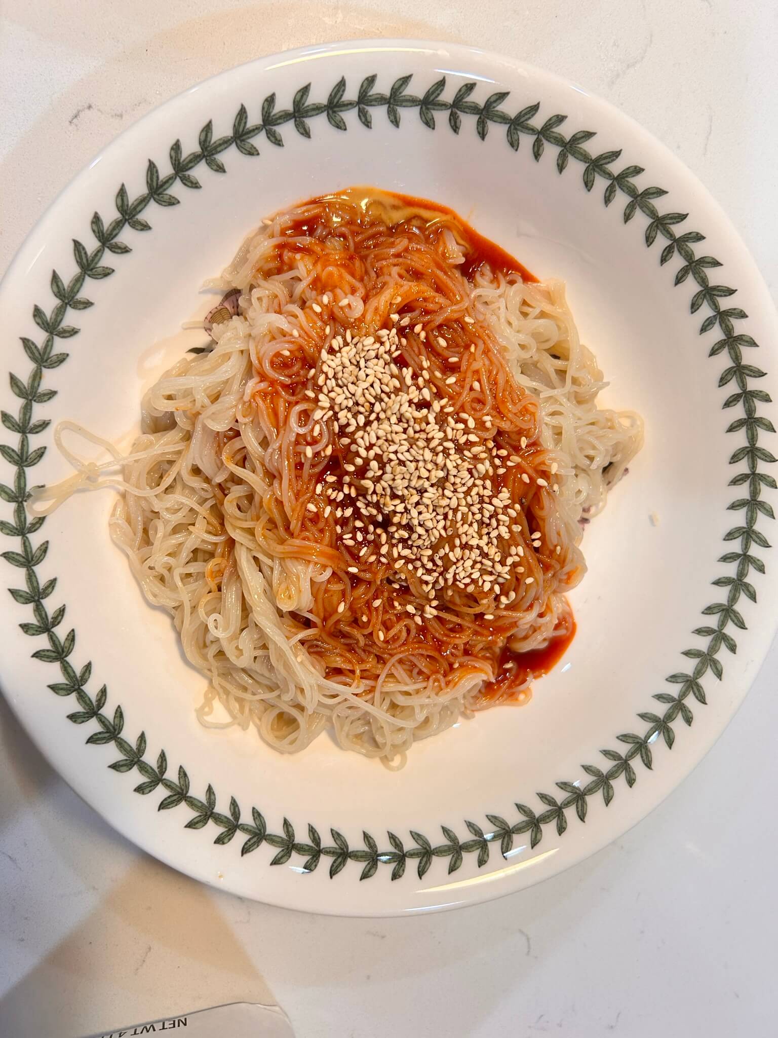 6. 한쪽은 준비된 비빔냉면 소스를 부어줍니다.