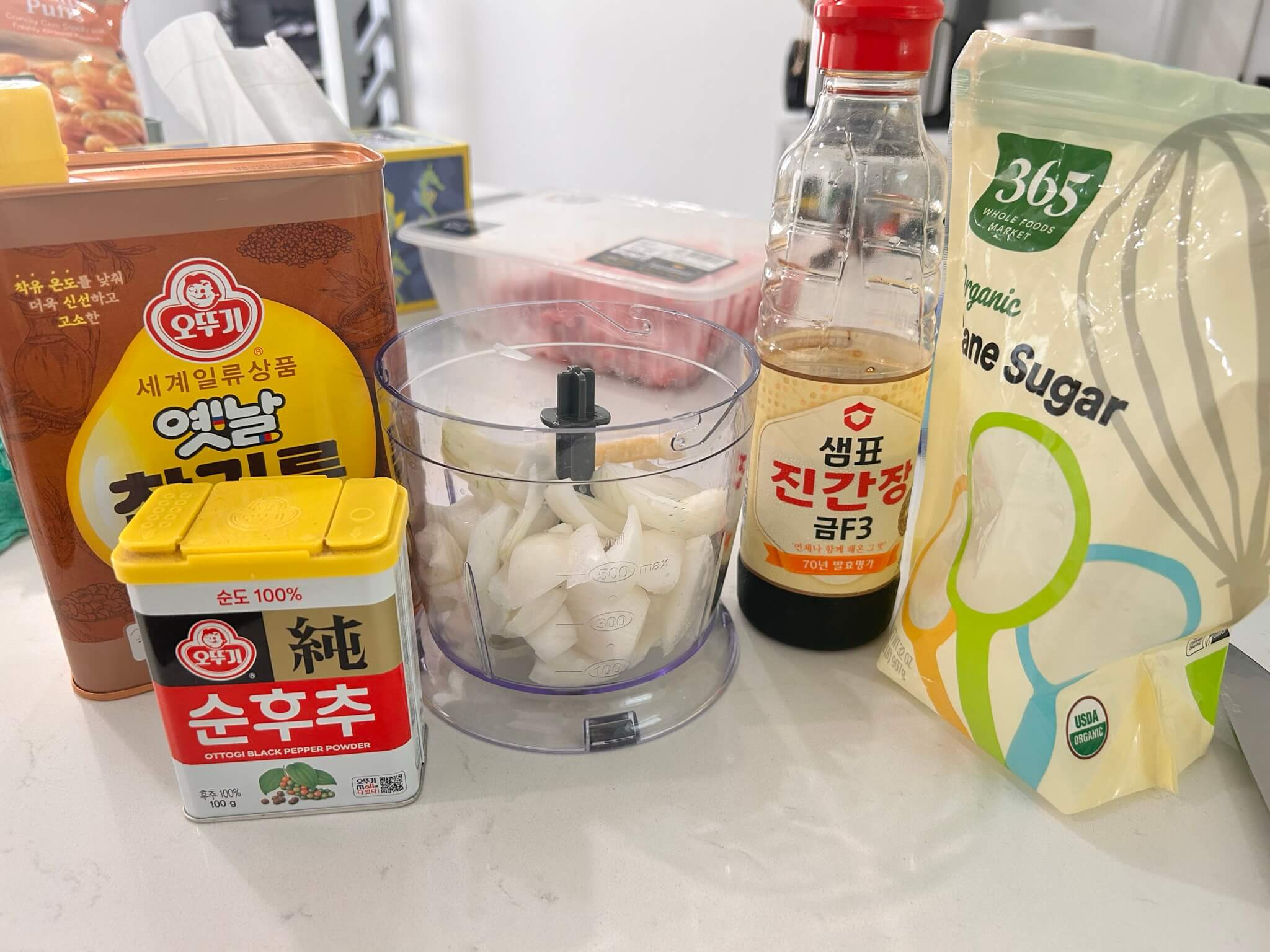 3. 간장 4, 설탕 2, 다진 마늘 1, 간양파, 참기름 1, 후추를 믹서에 같이 넣어줍니다.