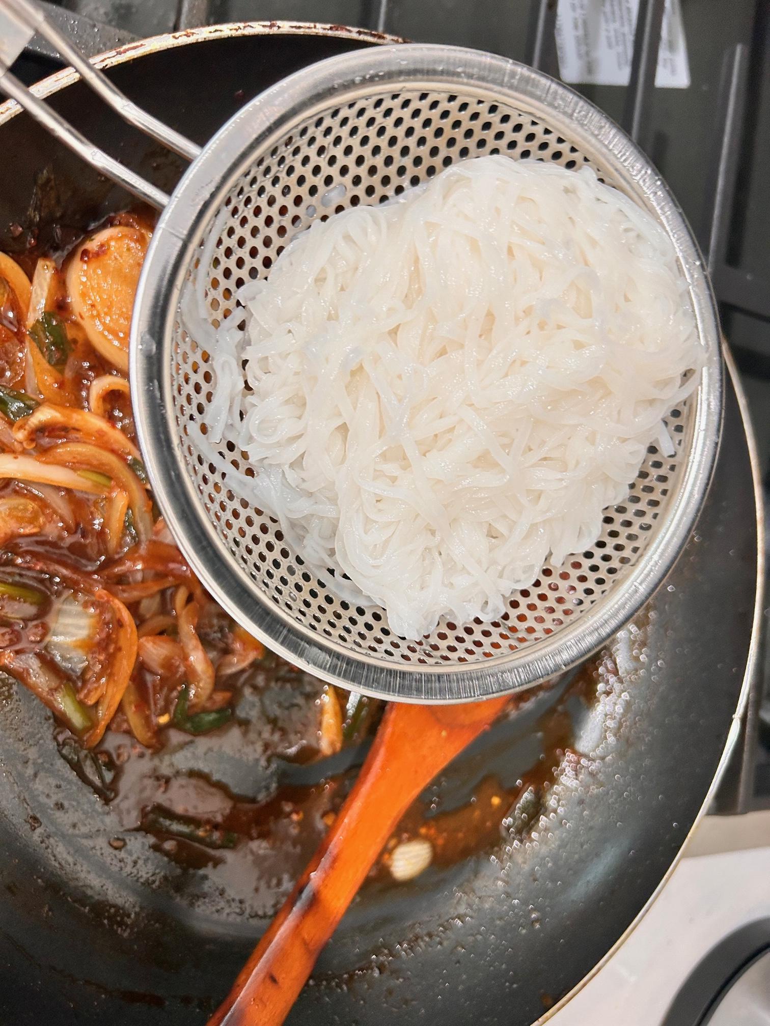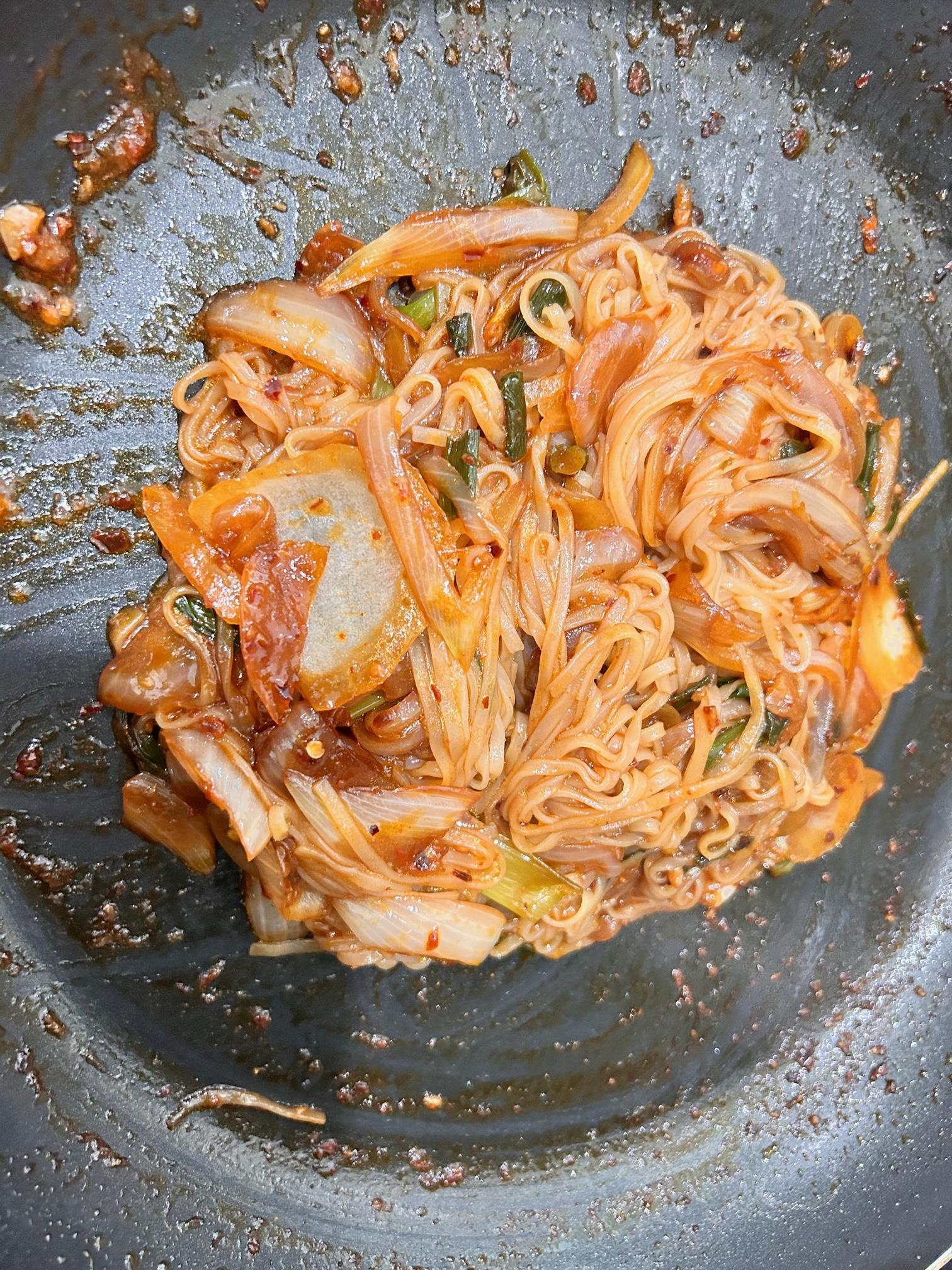 9. 삶은 면은 남은 소스에 넣고 한번 볶아줍니다.