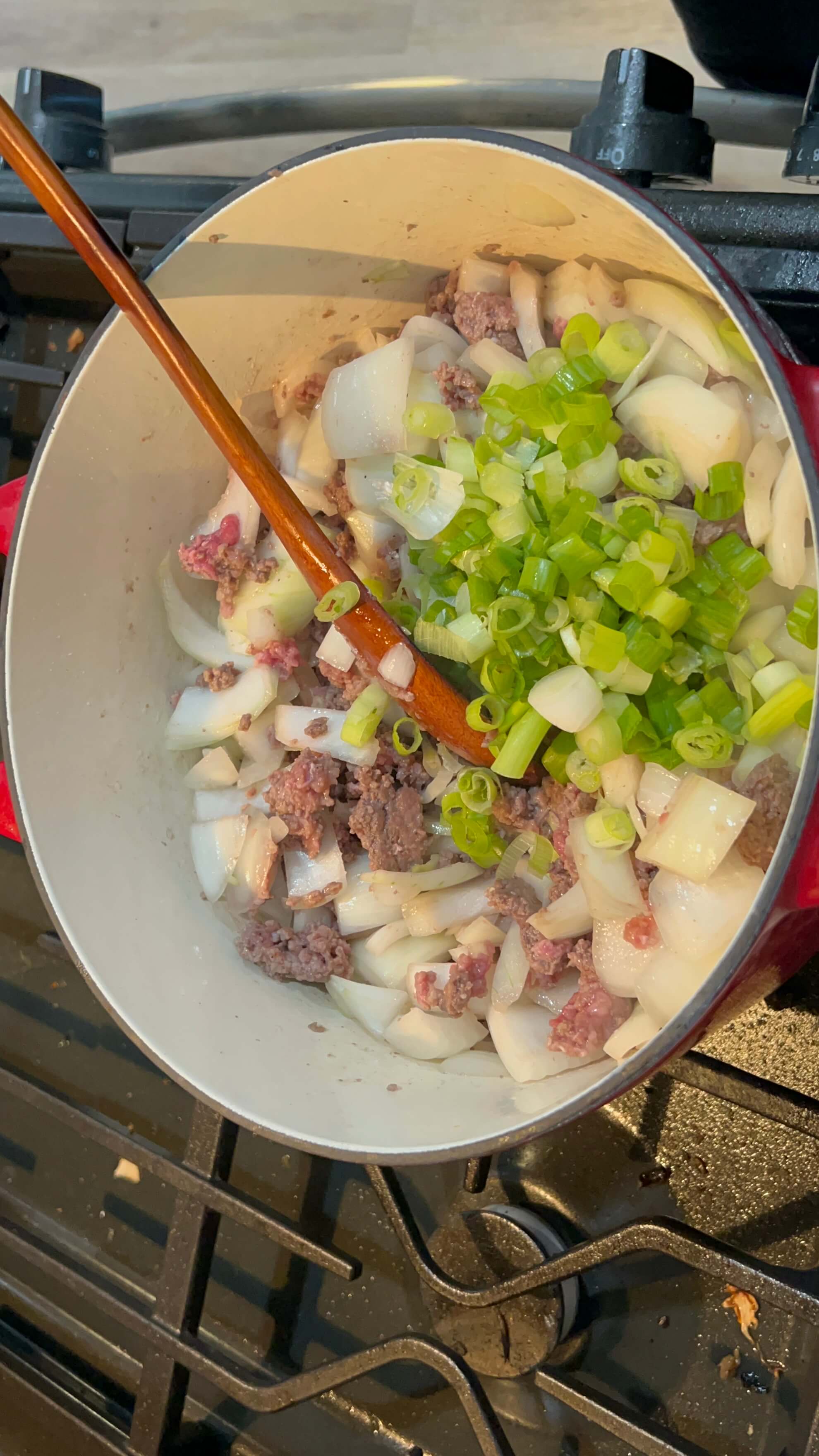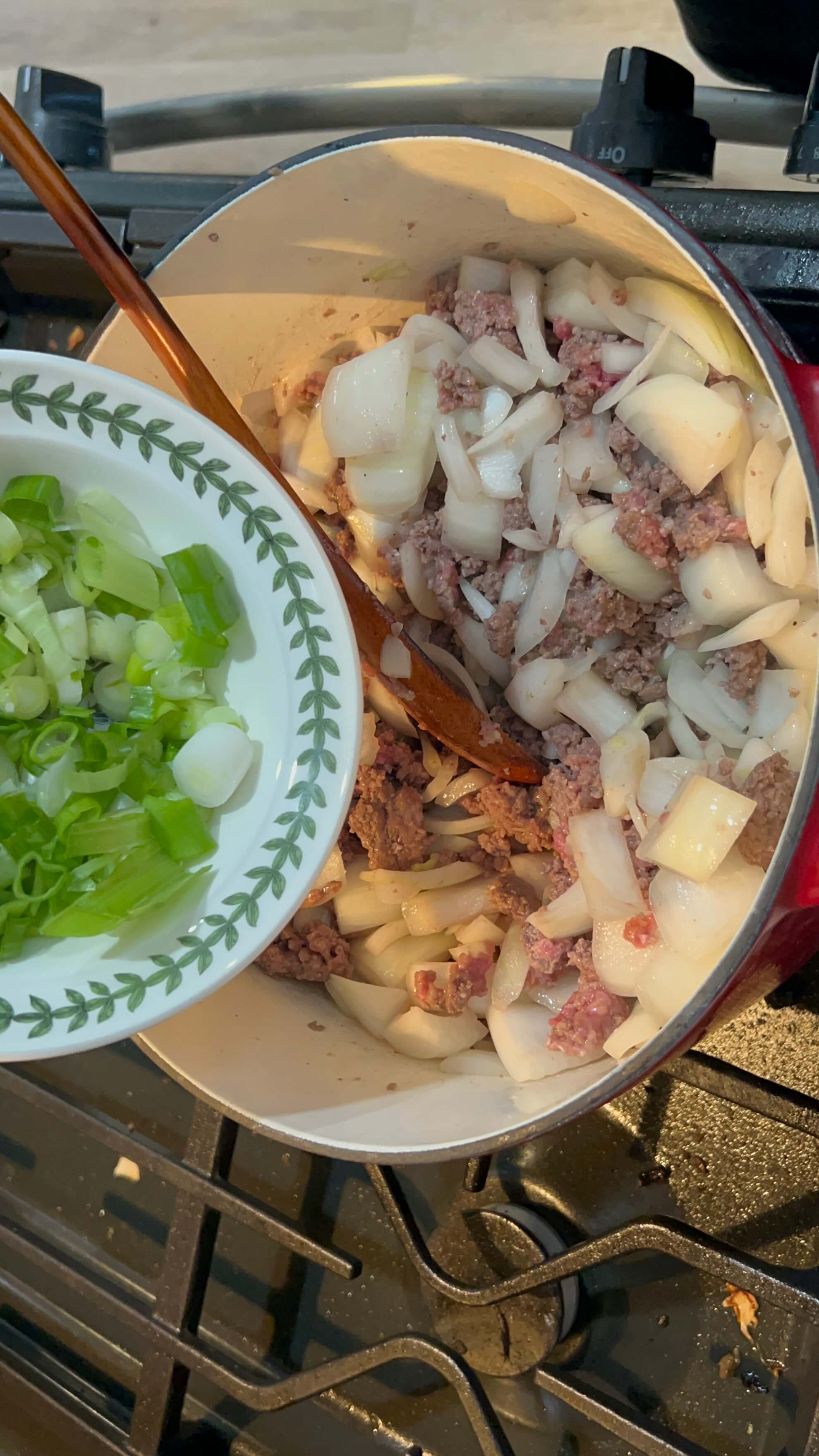 5. 손질한 양파와 대파를 넣고 고기와 같이 볶아줍니다.