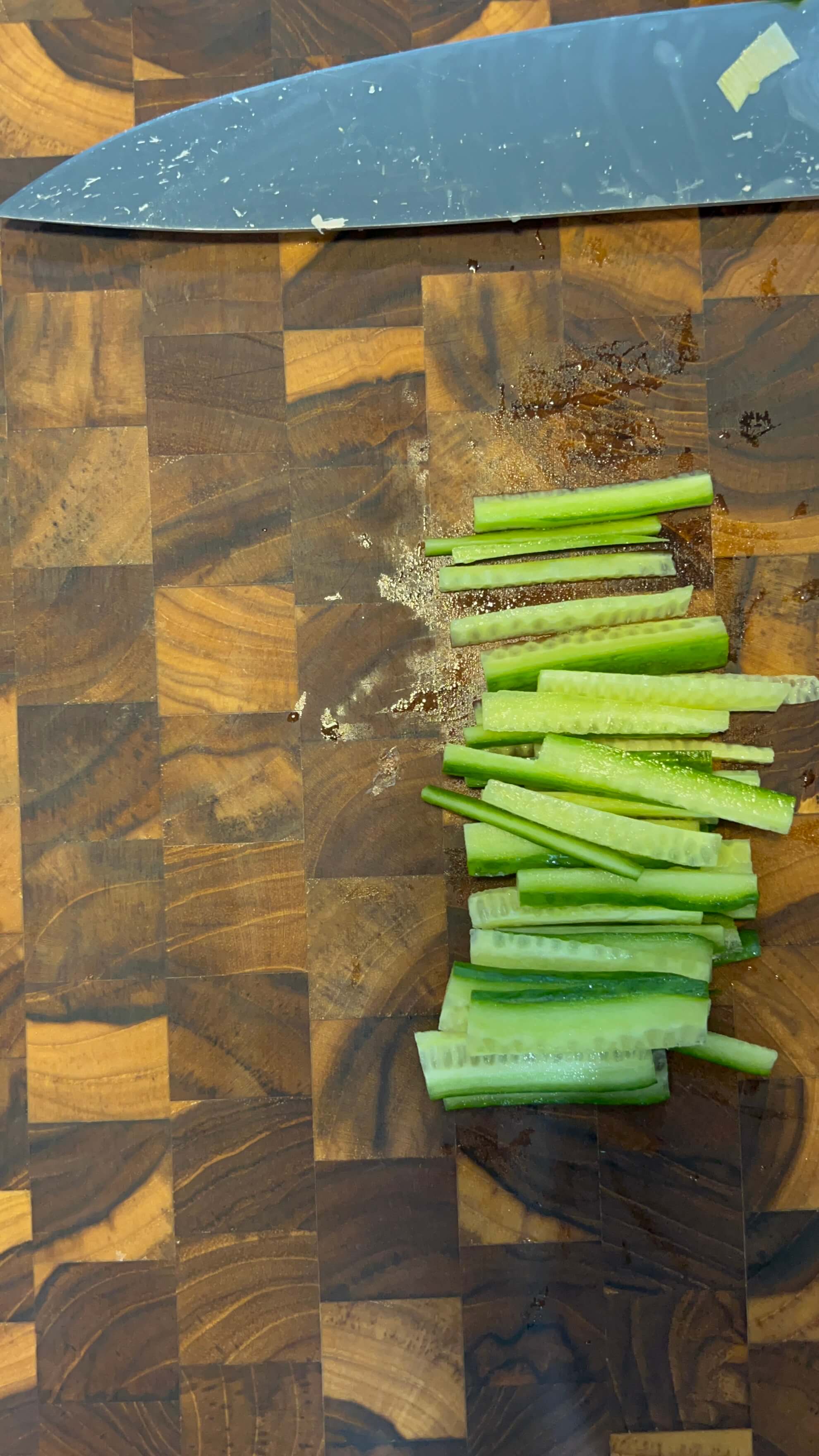 9. 짜장이 걸쭉해지는 동안 오이를 채 썰어서 준비해 줍니다.