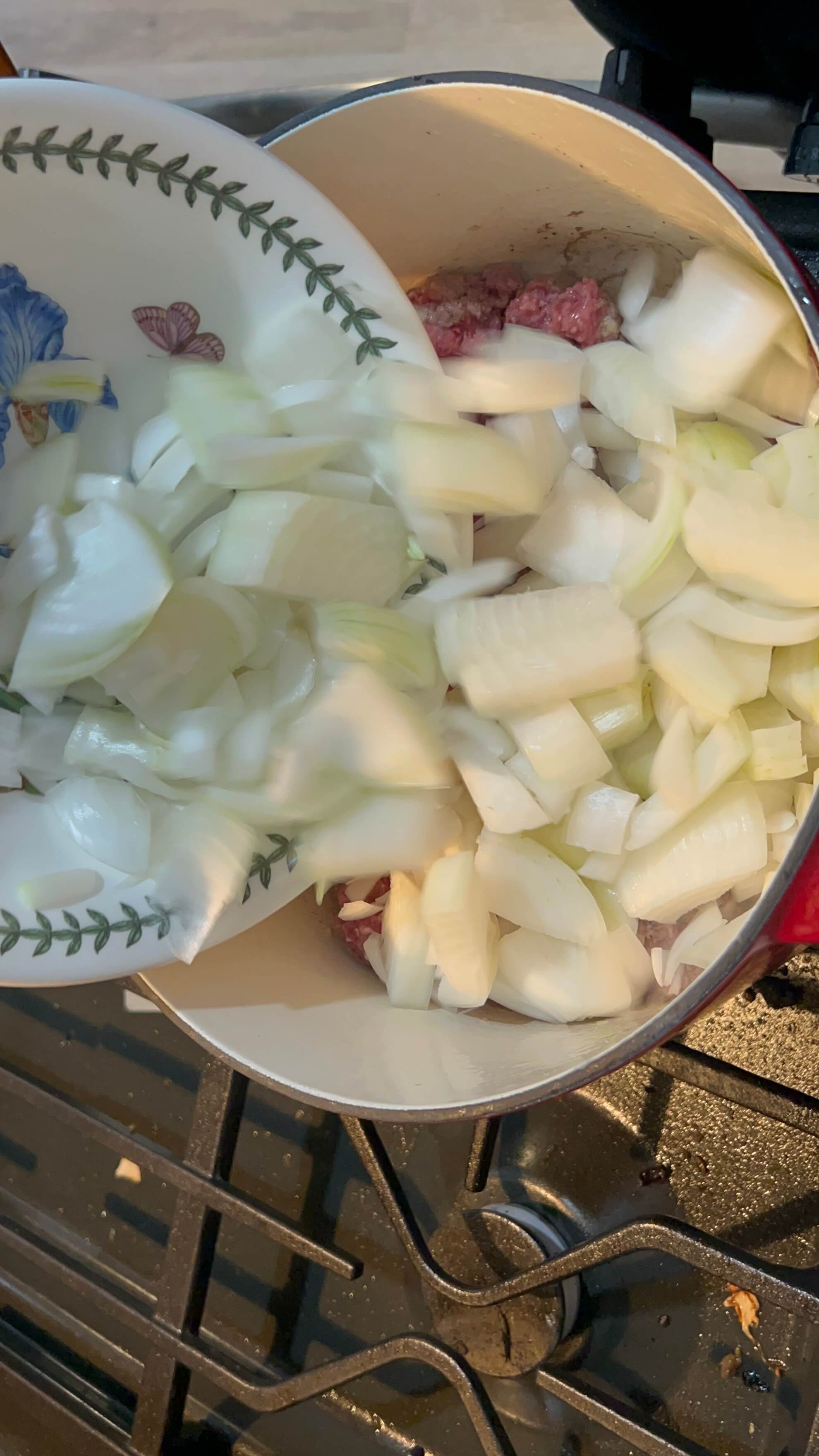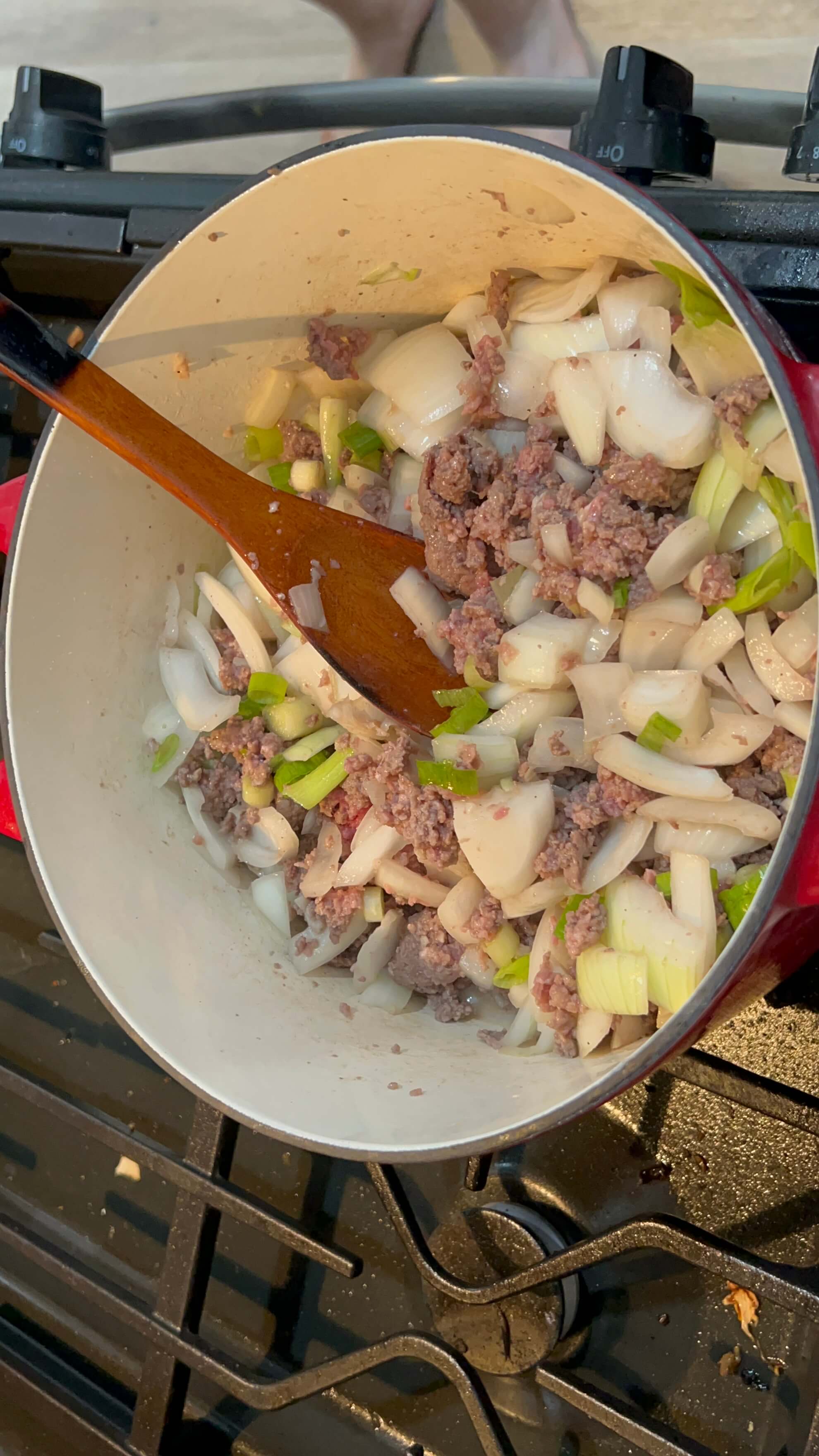5. 손질한 양파와 대파를 넣고 고기와 같이 볶아줍니다.