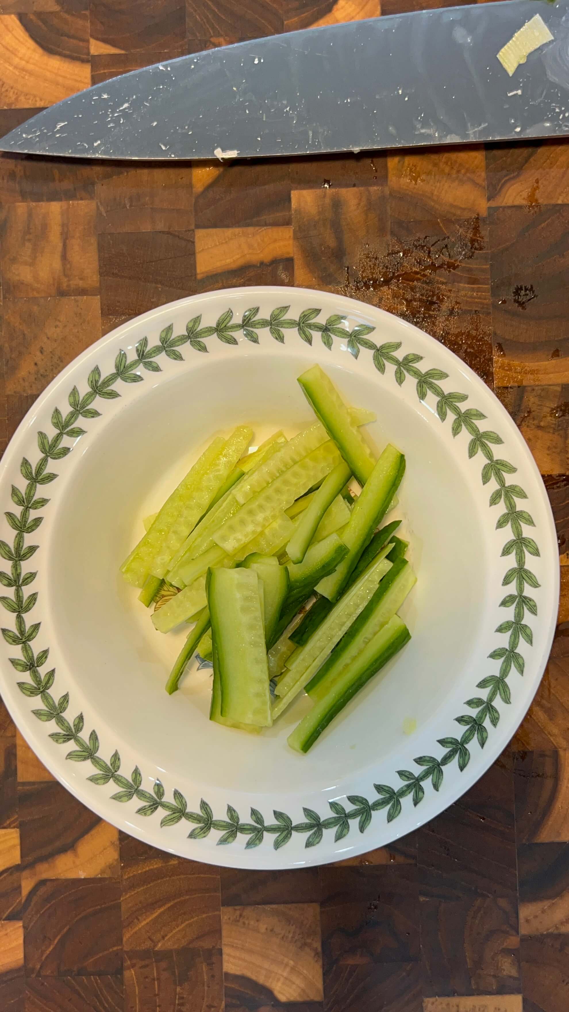 9. 짜장이 걸쭉해지는 동안 오이를 채 썰어서 준비해 줍니다.
