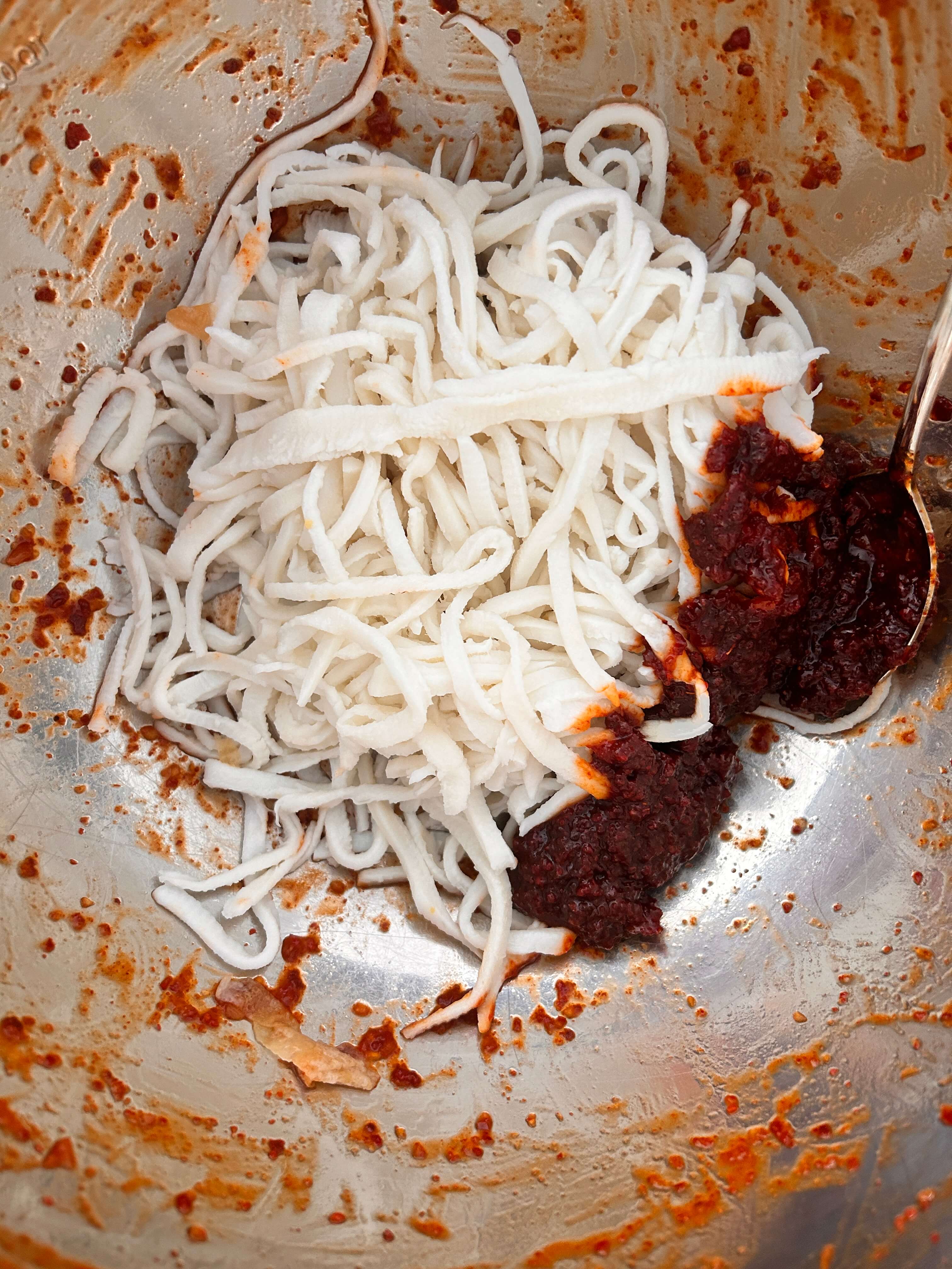 6. 어묵과 오징어채 (진미채)를 양념에 잘 버무려 줍니다.