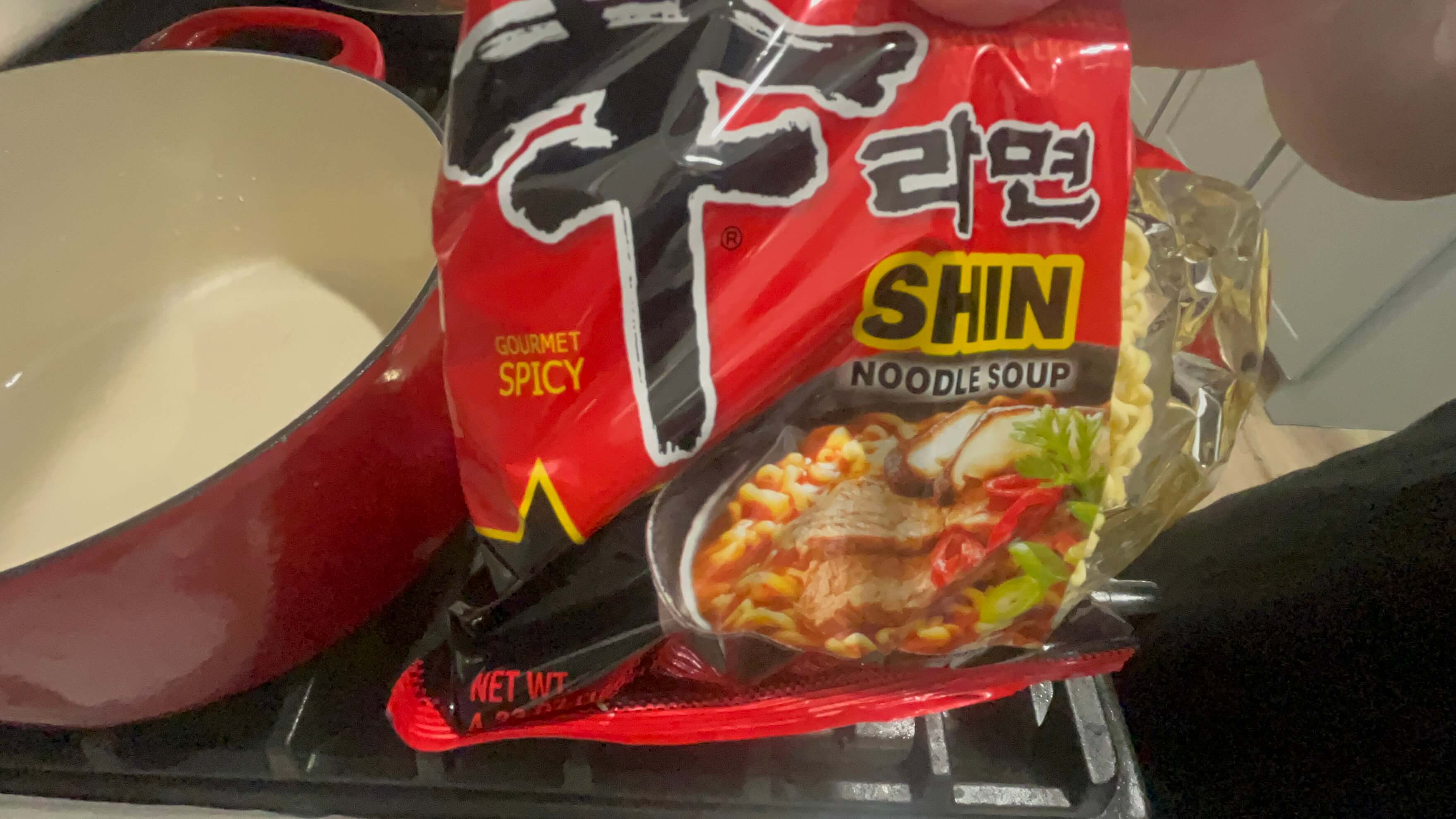 1. 신라면을 준비합니다. 물을 끓이고 스프랑 건더기를 넣어줍니다.