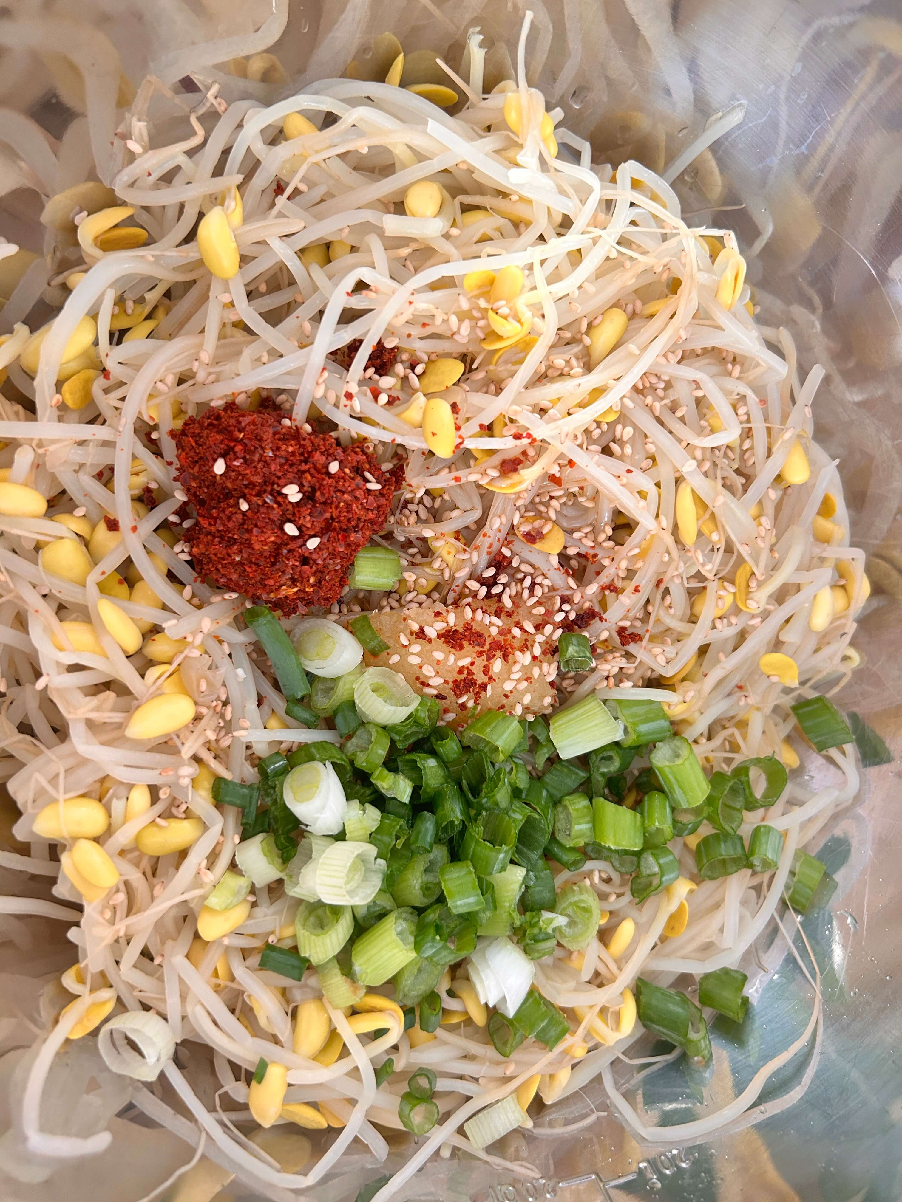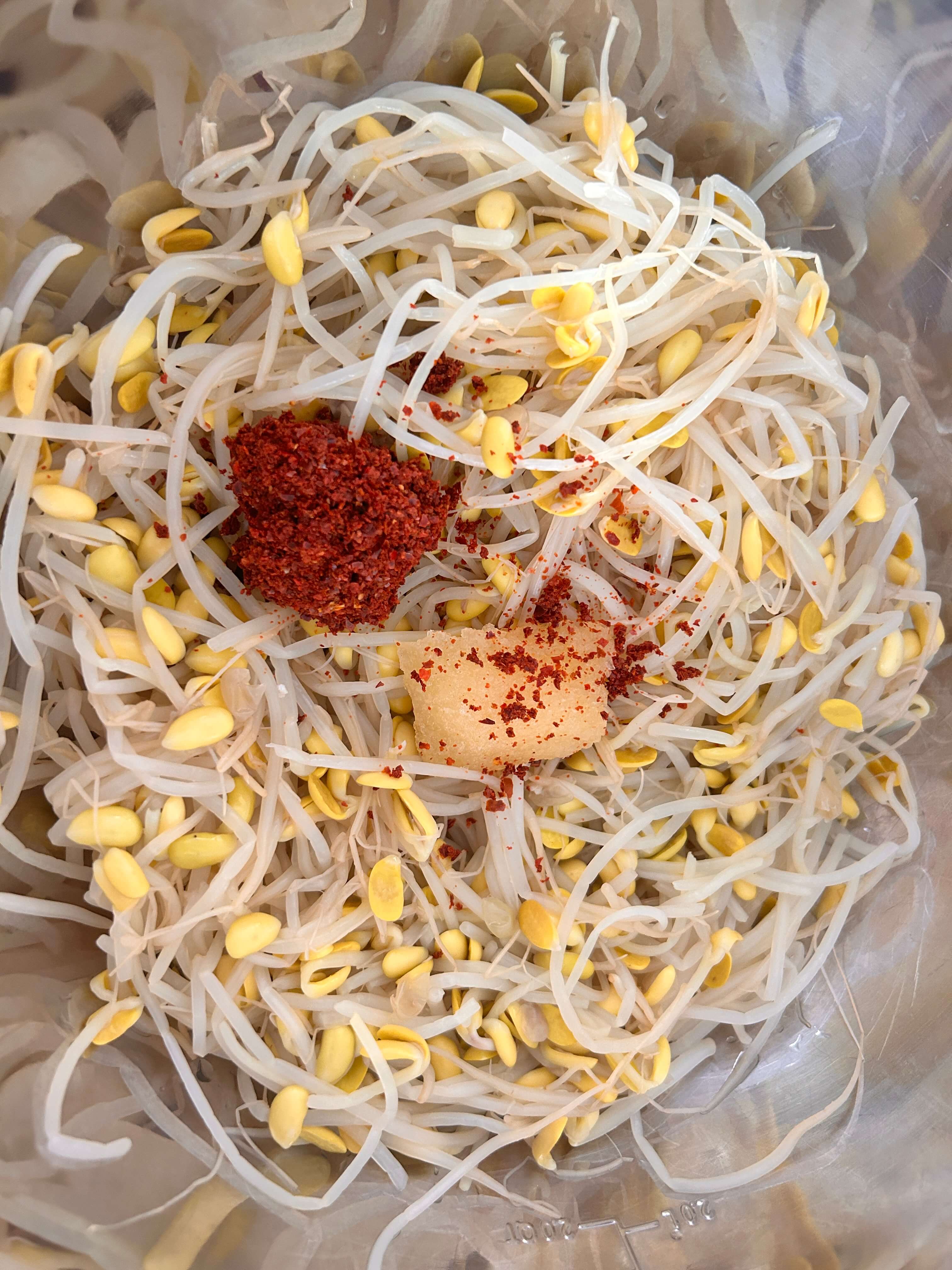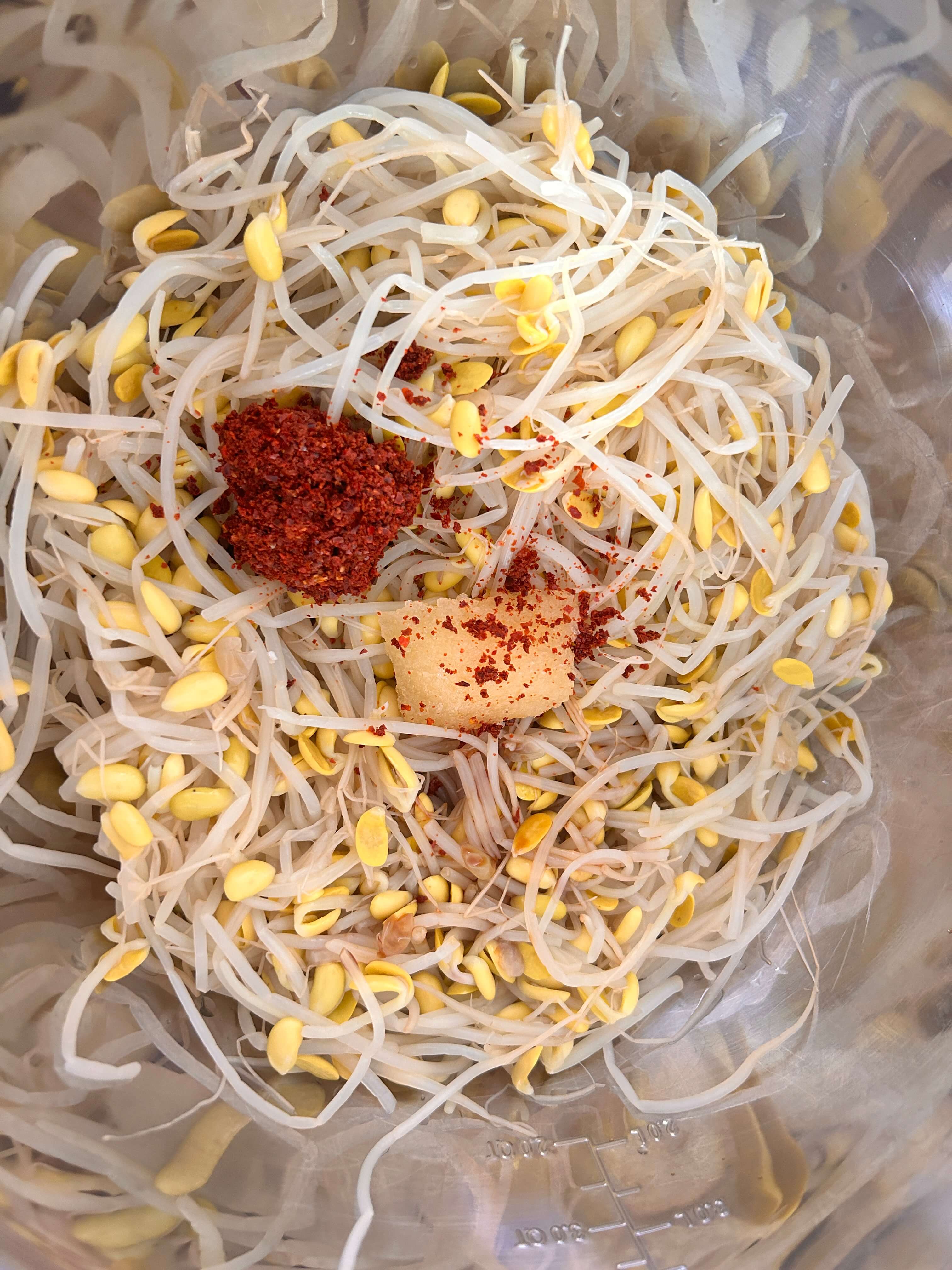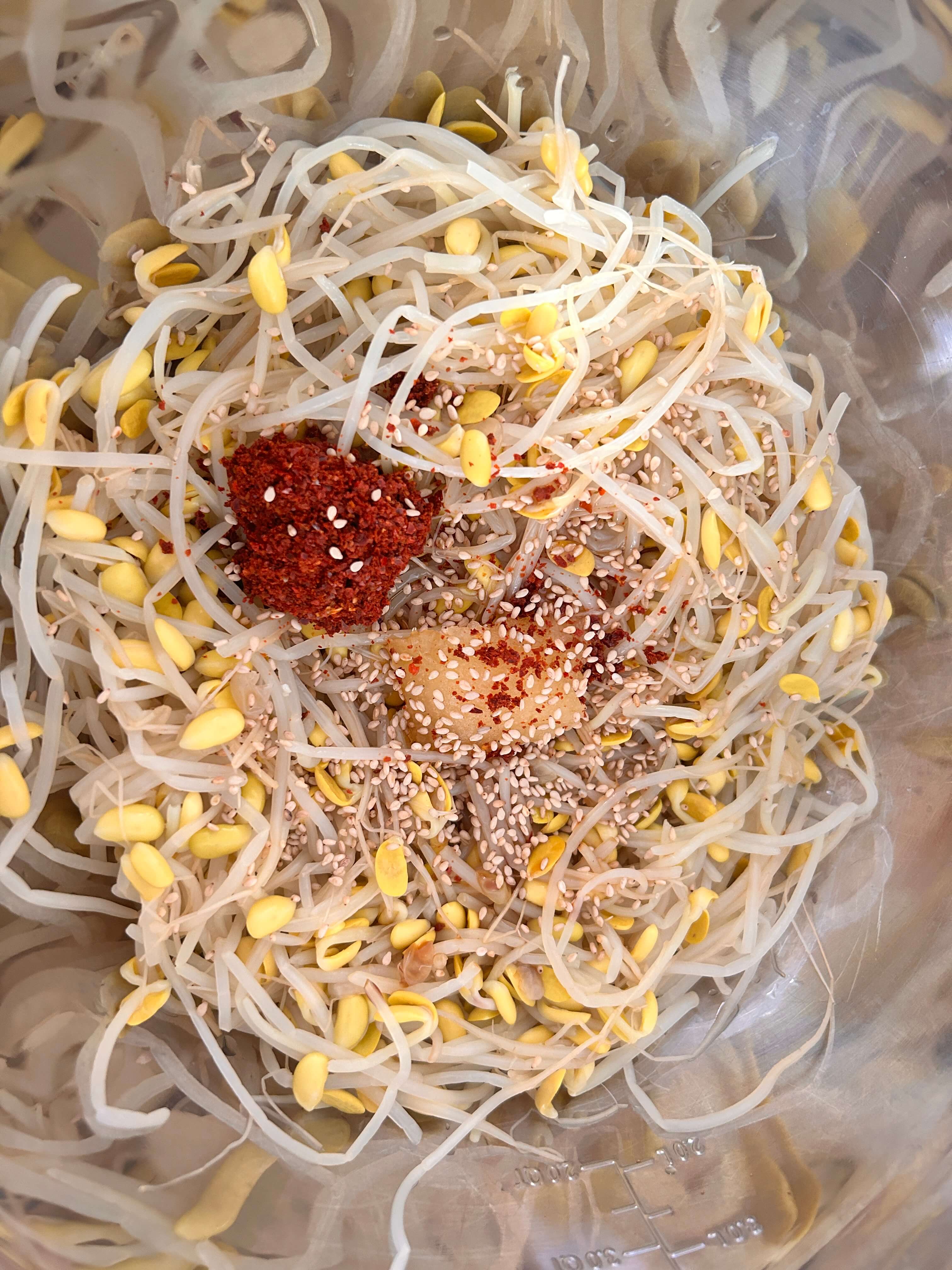 6. 데친 콩나물에 다진 마늘, 고춧가루, 진간장 한 숟갈, 참기름 한 숟갈을 넣어줍니다.