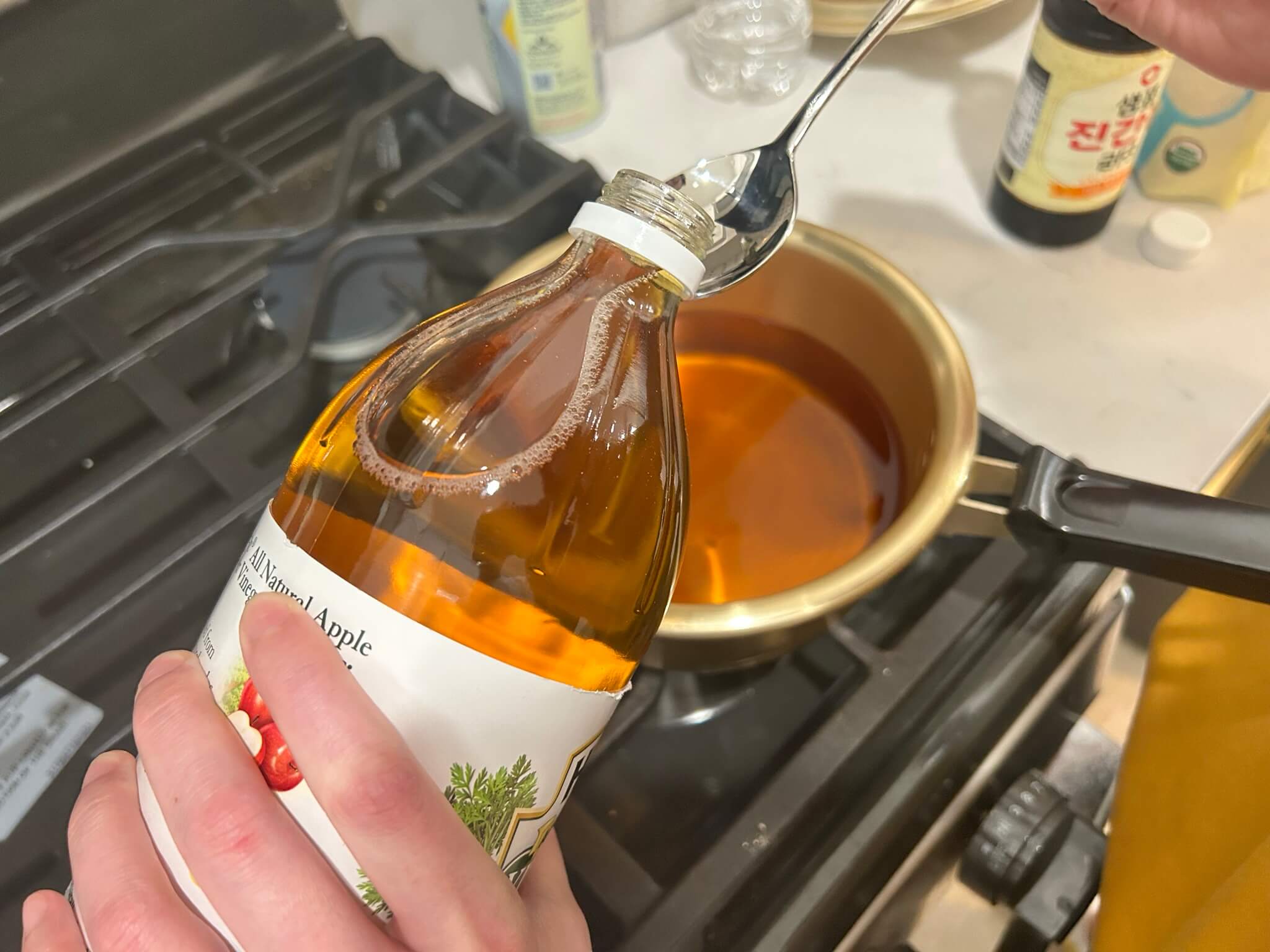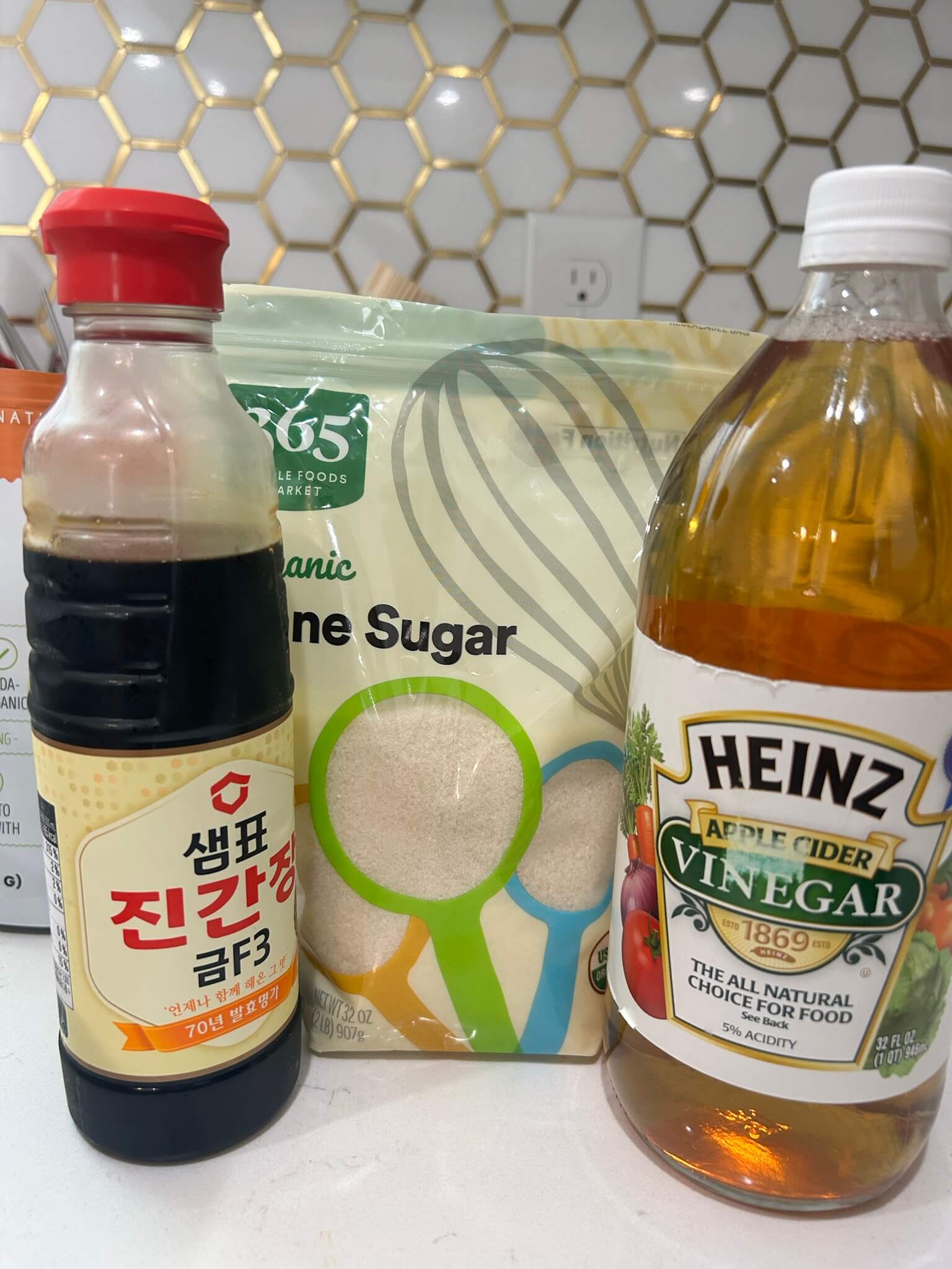 1. 양념재료(물, 간장, 식초, 설탕)를 준비합니다. 감자전분은 조금 물에 풀어서 준비합니다.