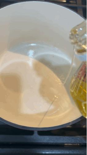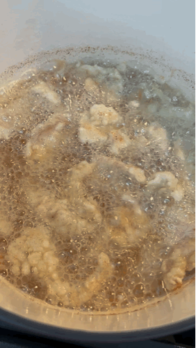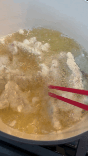 6. 냄비에 기름을 부어준 뒤, 온도가 올라가면 고기를 튀겨주기 시작합니다.