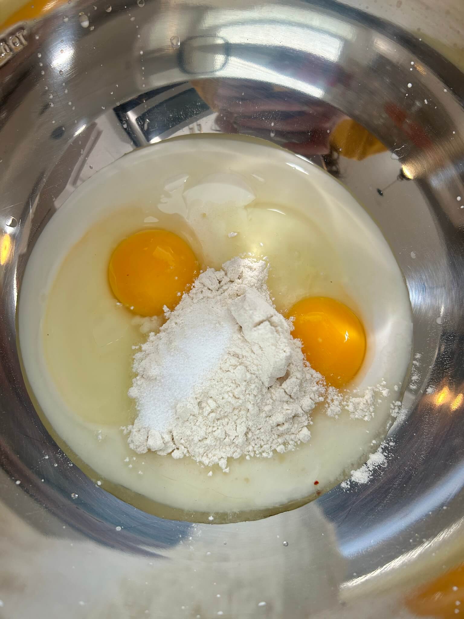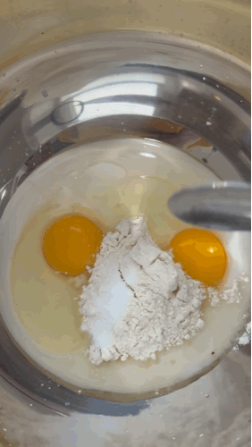 4. 물층을 제거한 전분에 계란 두 개와 밀가루를 넣고 잘 섞어 반죽을 만듭니다.