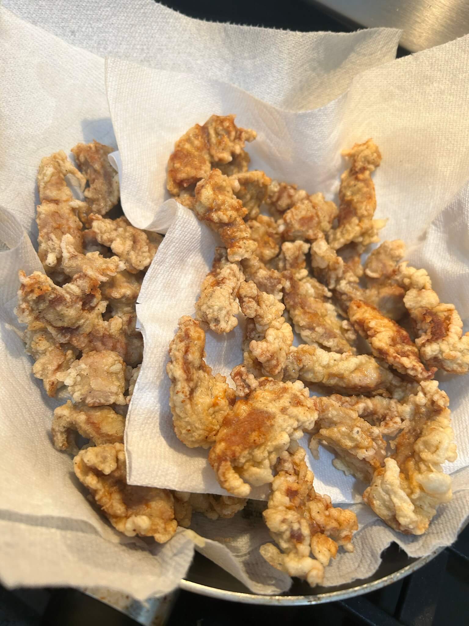 7. 튀겨진 고기는 키친타월을 깔아 기름이 빠지도록 합니다.