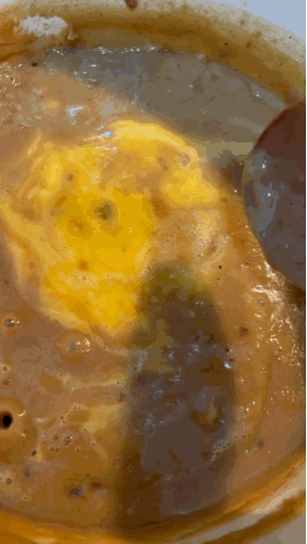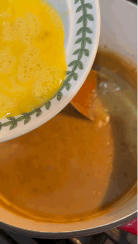 7. 계란물을 넣고 잘 저어줍니다. 계란물 넣은 뒤 바로 저어주시지 말고 조금 익어갈 때즘부터 저어 주시는 게 좋습니다.