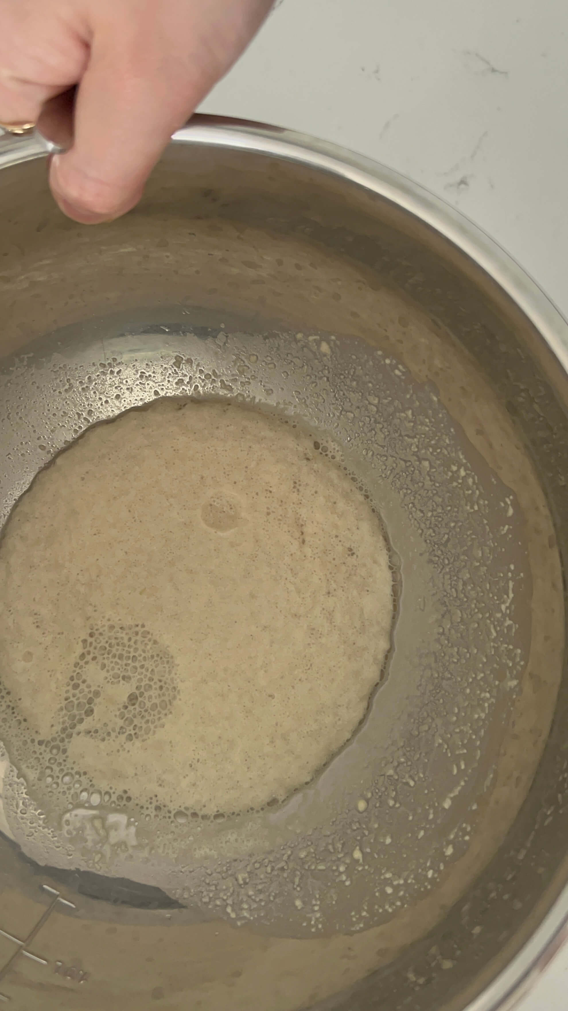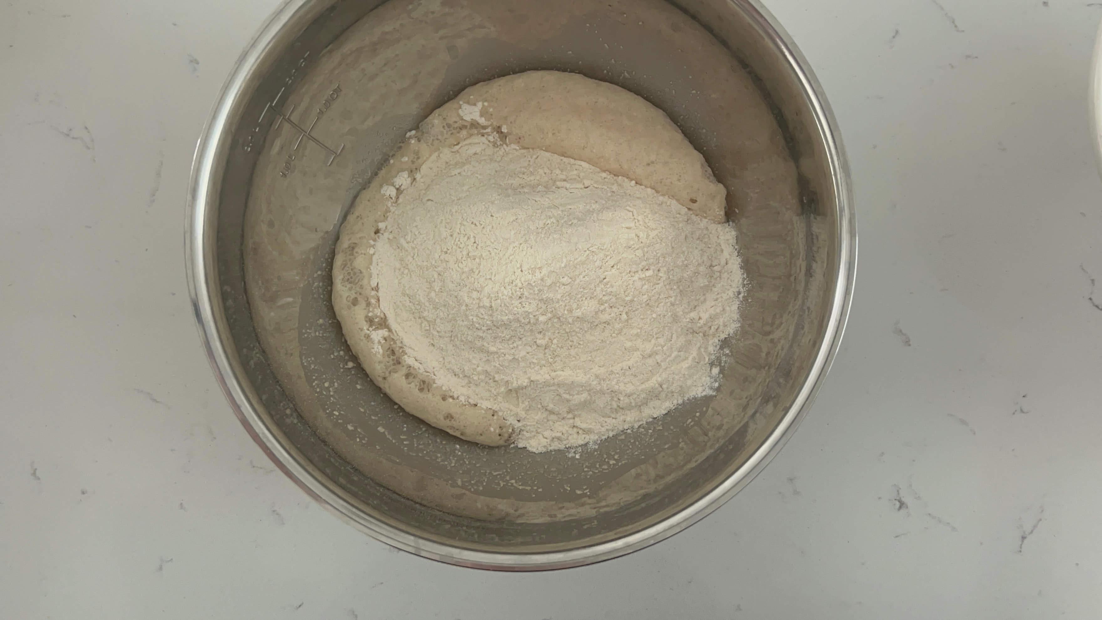5. 준비된 밀가루를 발효시킨 이스트에 넣어줍니다.