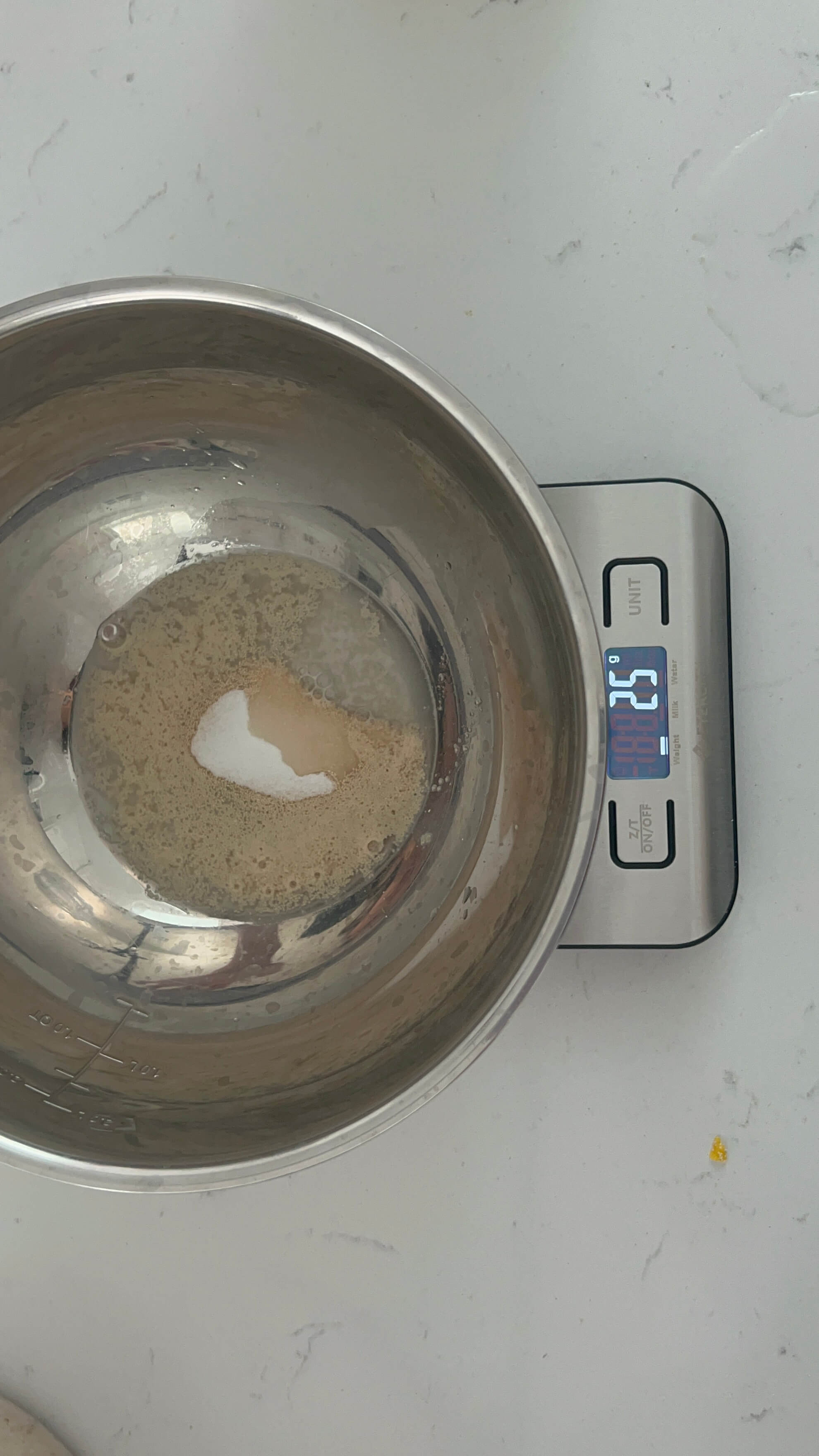 2. 설탕을 4g 넣어주시고 따뜻한 물을 넣어줍니다. 설탕이랑 물까지 25g 정도 되었네요~~^^