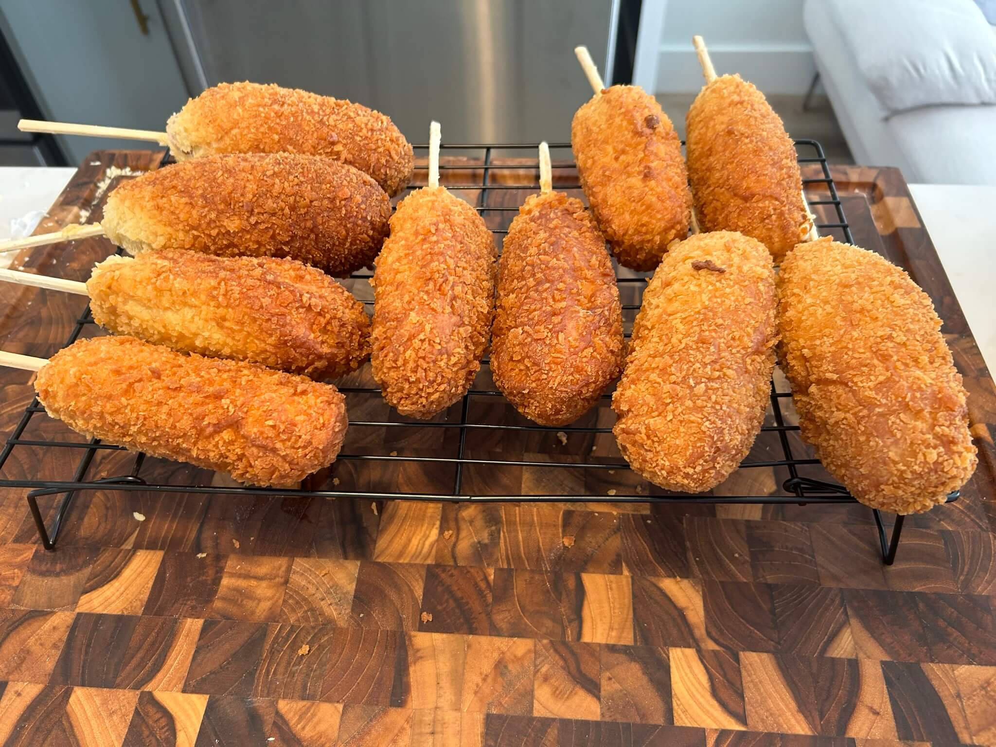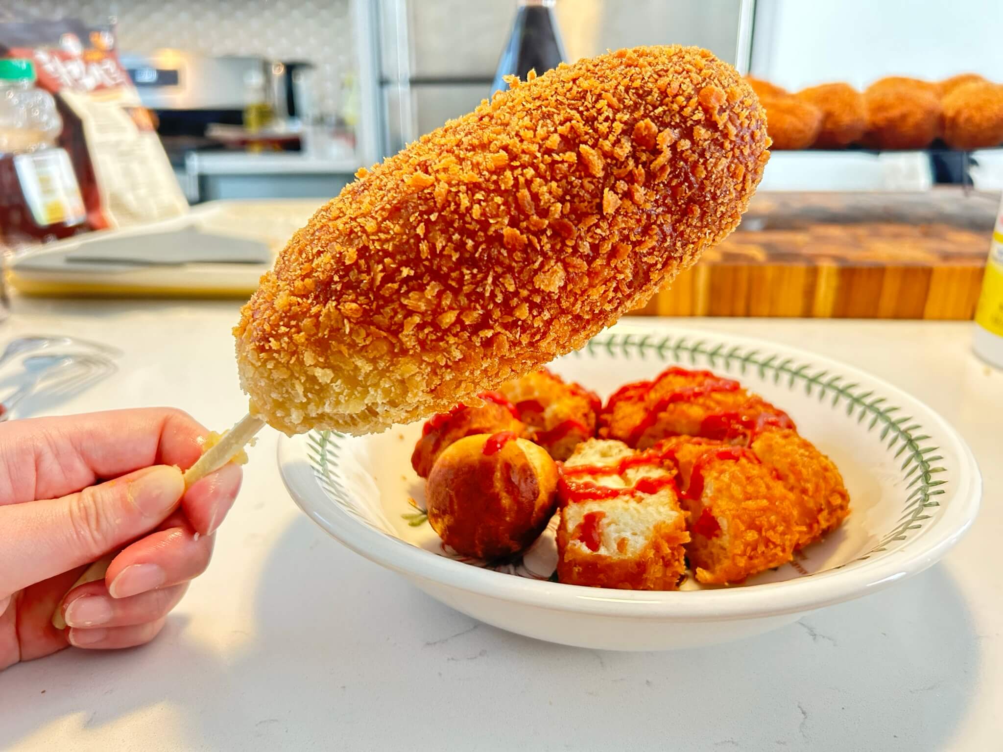 에어후라이기에 몇 분만 돌려주시면 갓 만든 핫도그가 됩니다.