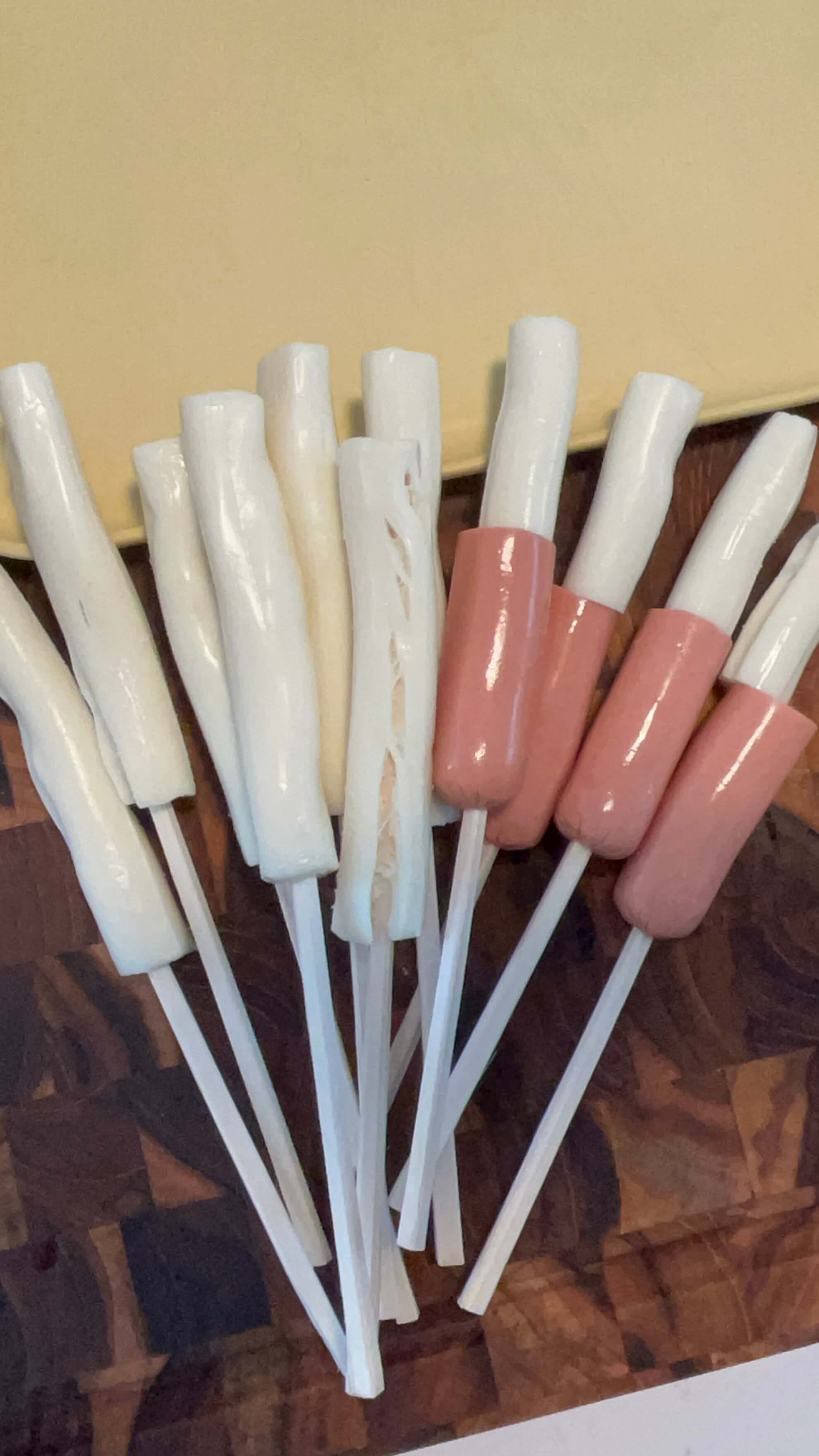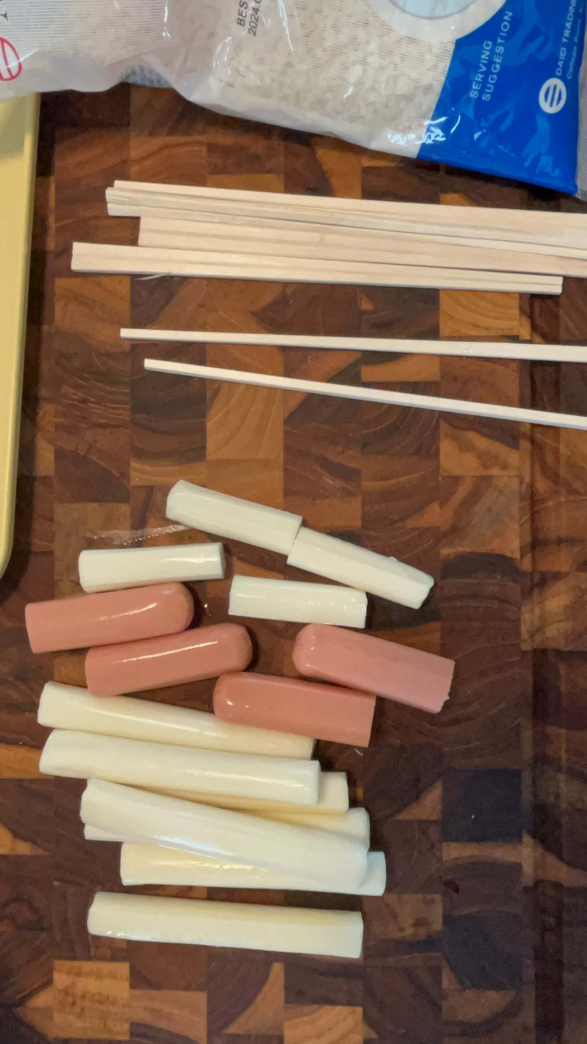7. 젓가락에 치즈와 소시지를 꽂아줍니다.