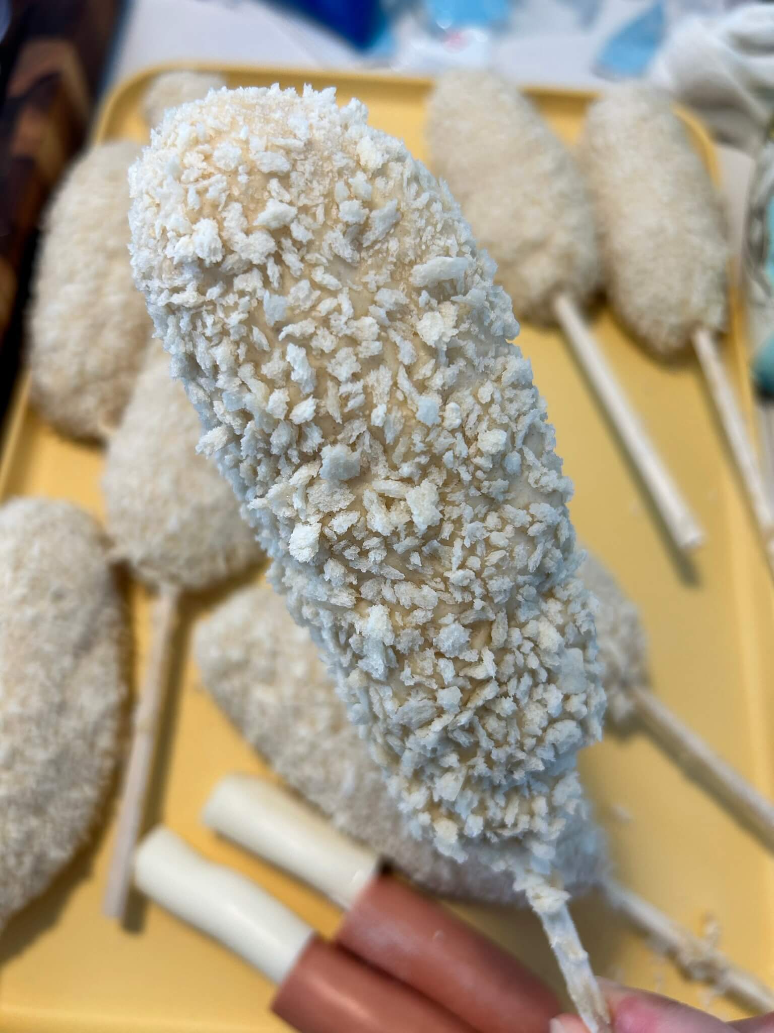 9. 준비된 꼬치에 반죽을 먼저 발라주어 모양을 잡아준 뒤, 빵가루를 발라줍니다.