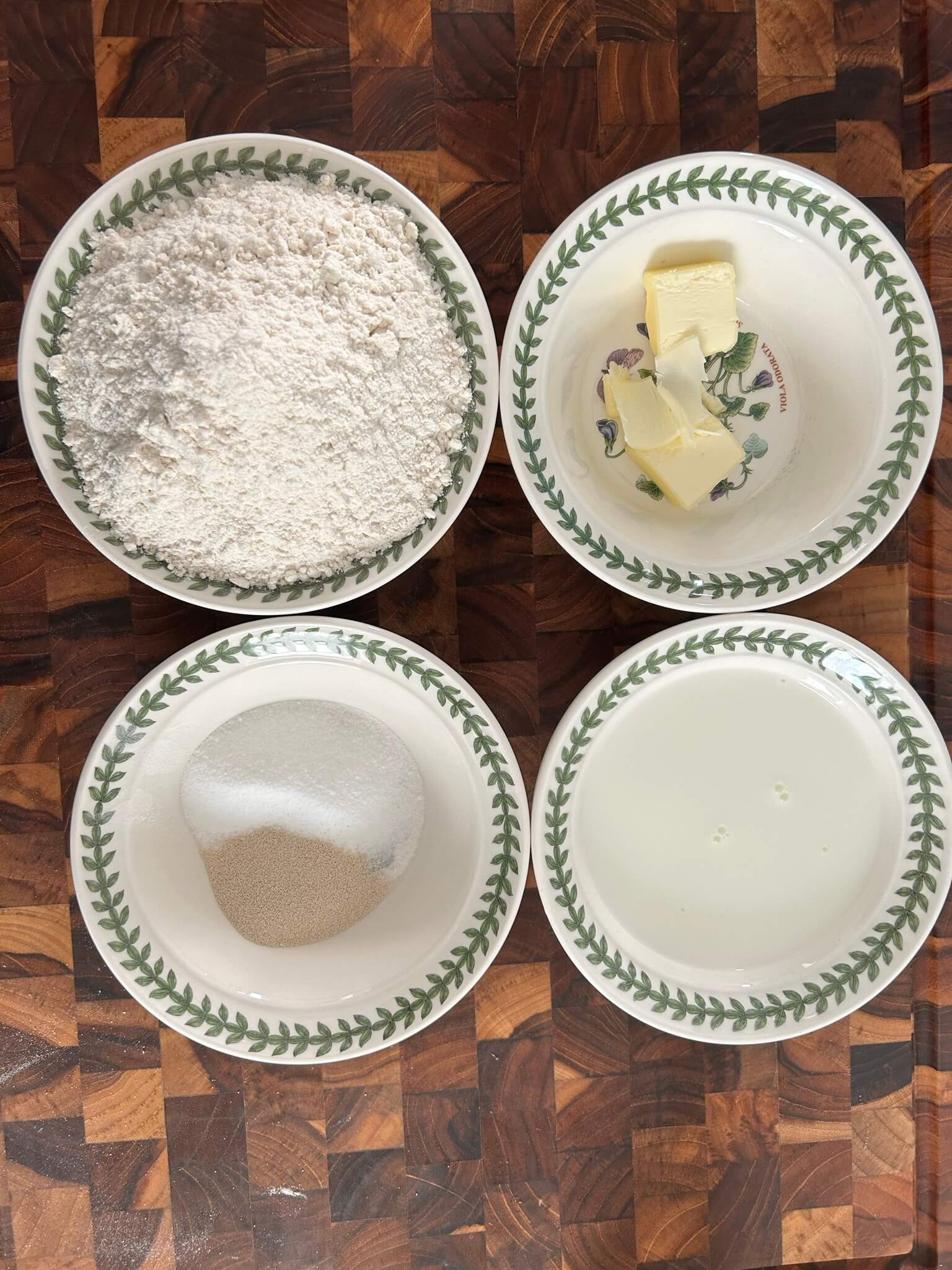 1. 밀가루 360g, 버터 30g , 이스트 6g, 설탕 30g, 소금 5g, 우유 210g를 계량하여 준비합니다.