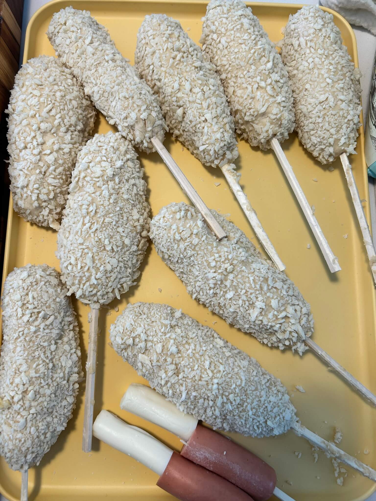 9. 준비된 꼬치에 반죽을 먼저 발라주어 모양을 잡아준 뒤, 빵가루를 발라줍니다.