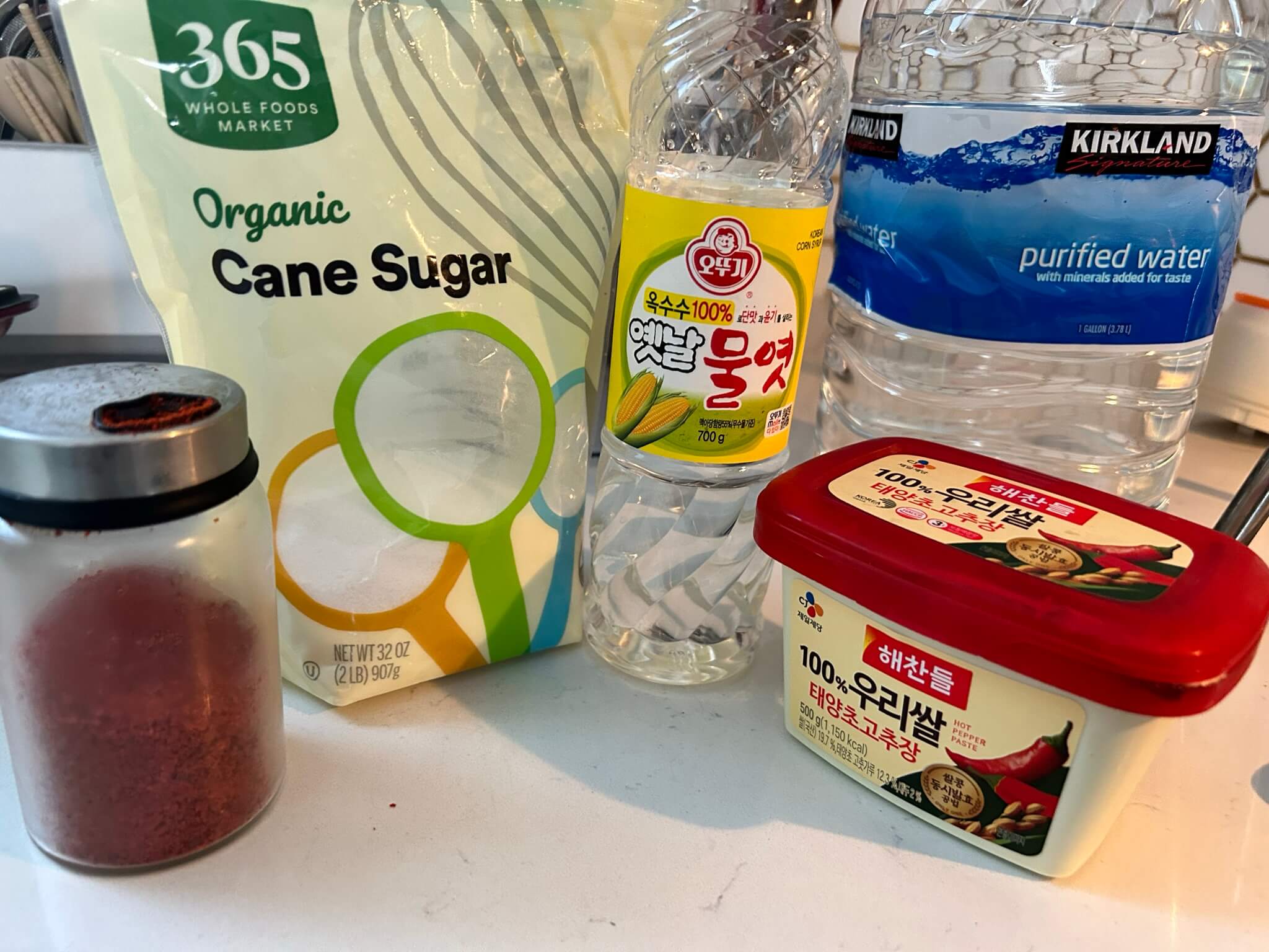 1. 냄비에 물 200ml에 설탕 1, 고춧가루 1.5, 고추장 3.5, 물엿 6스푼을 넣어줍니다.