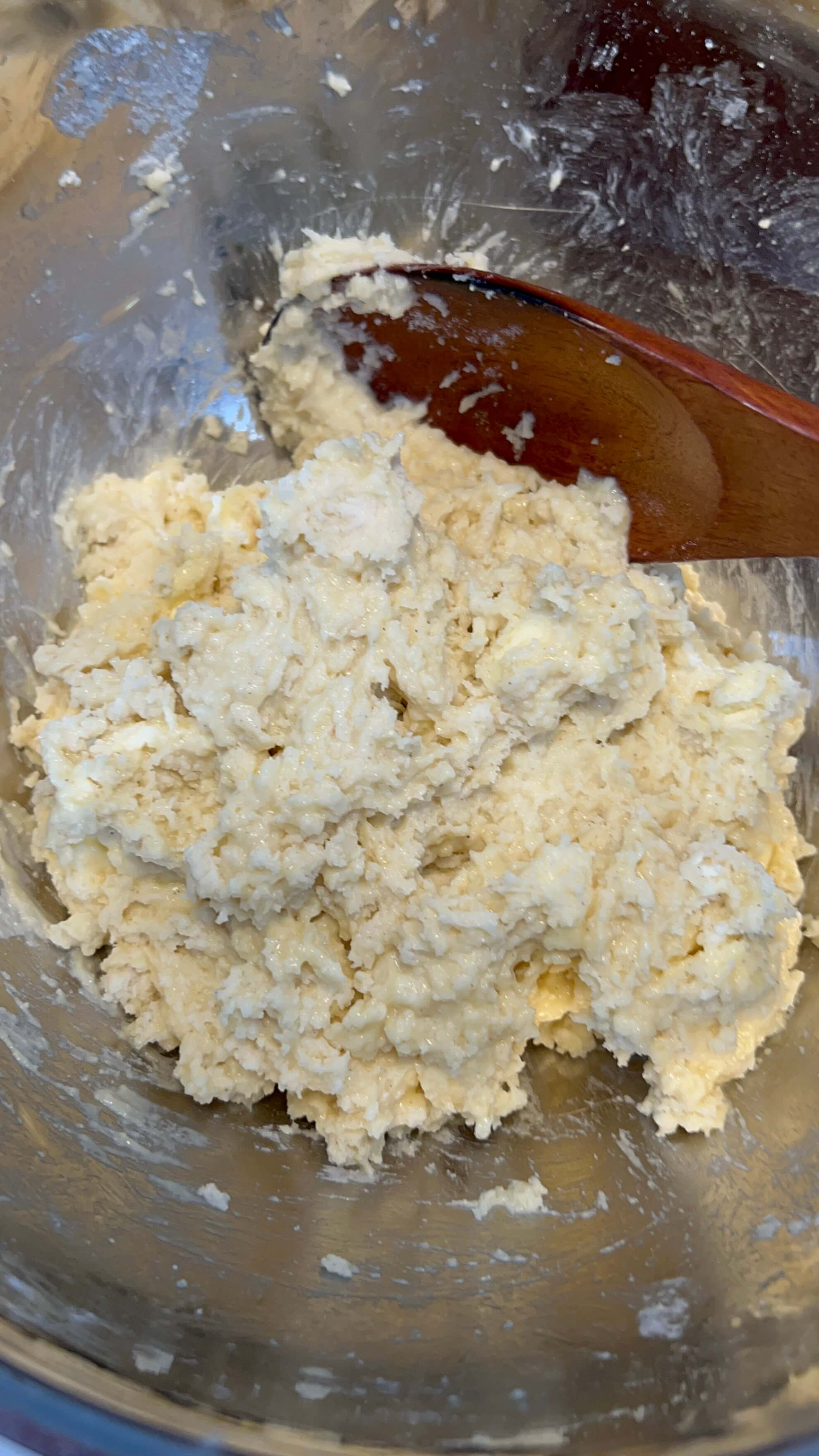 반죽할 때 주걱으로 잘라내듯이 섞어주시는 게 좋습니다.
