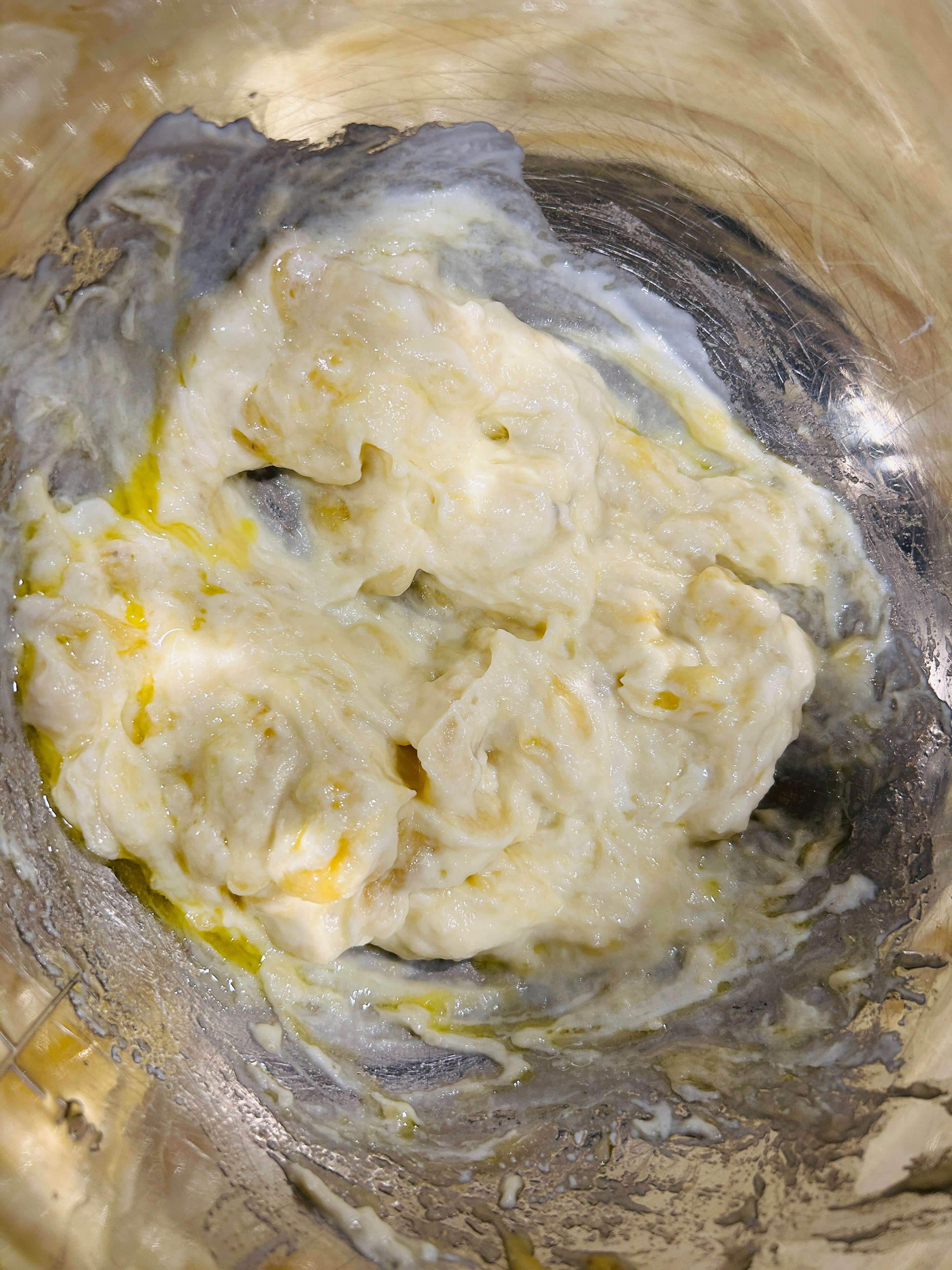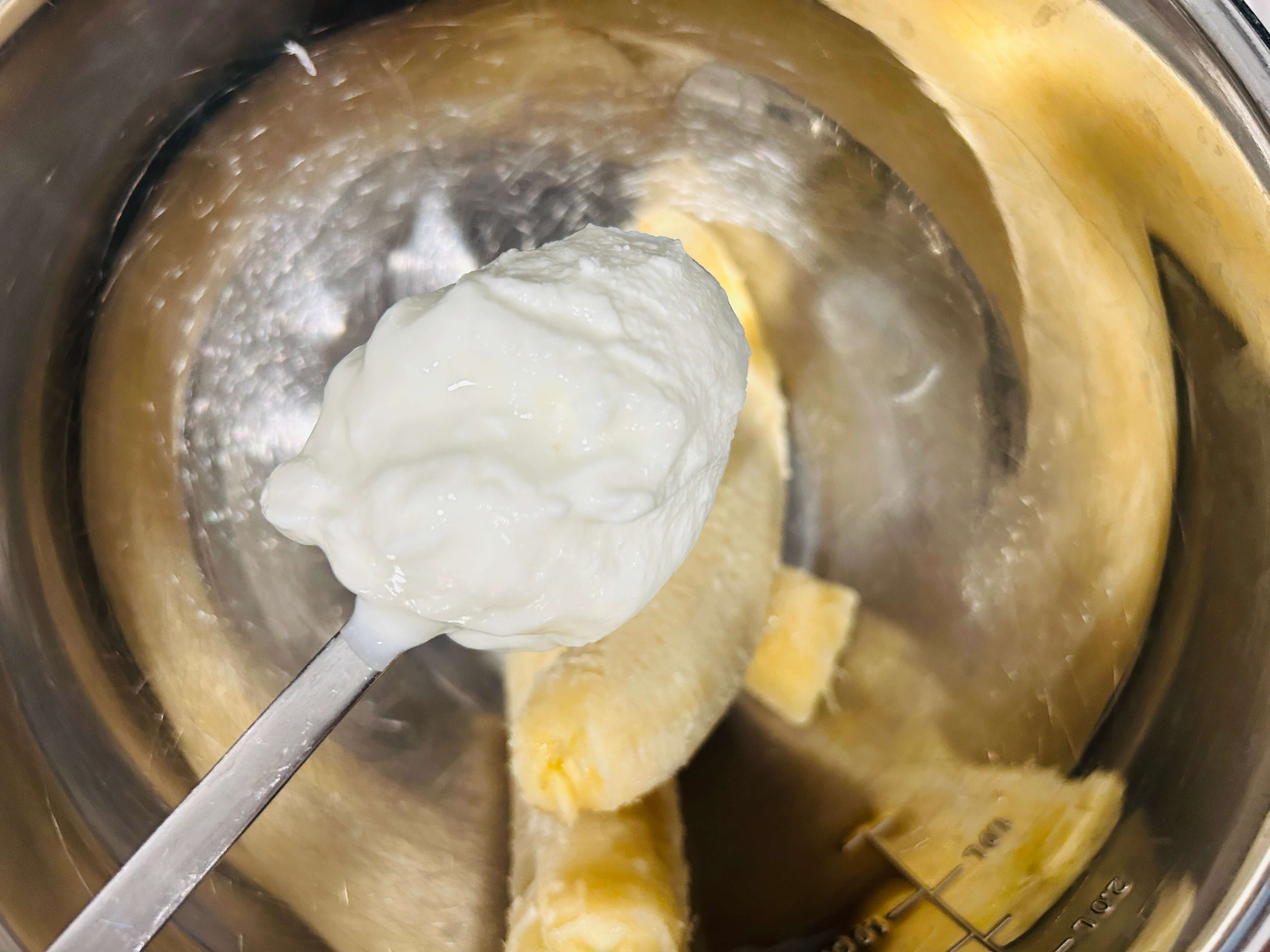 2. 바나나 2개, 그릭요거트 1 숟갈, 올리브오일 4 숟갈을 넣어 잘 섞어줍니다.