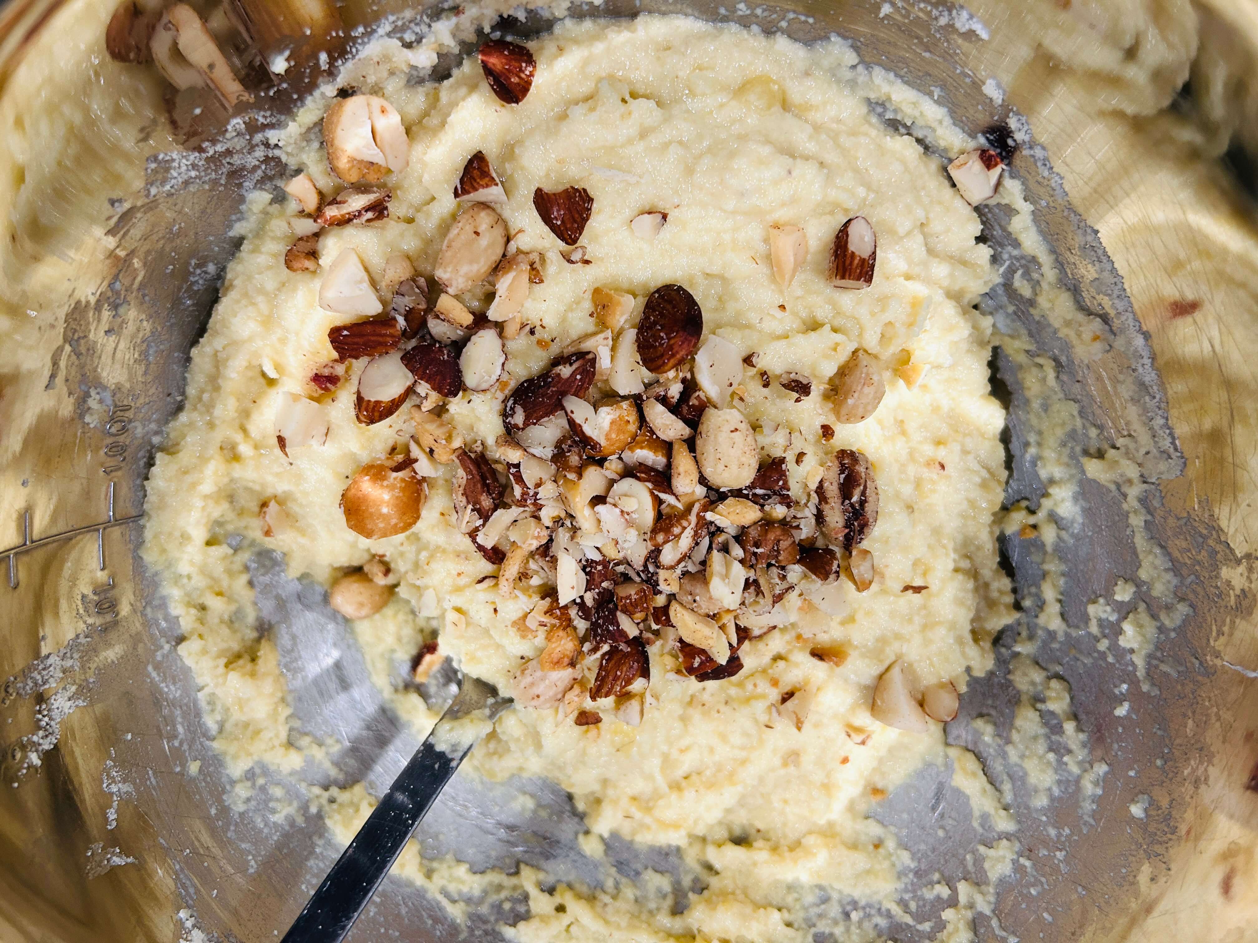 7. 남은 넛츠 반을 반죽 위에 뿌려줍니다.