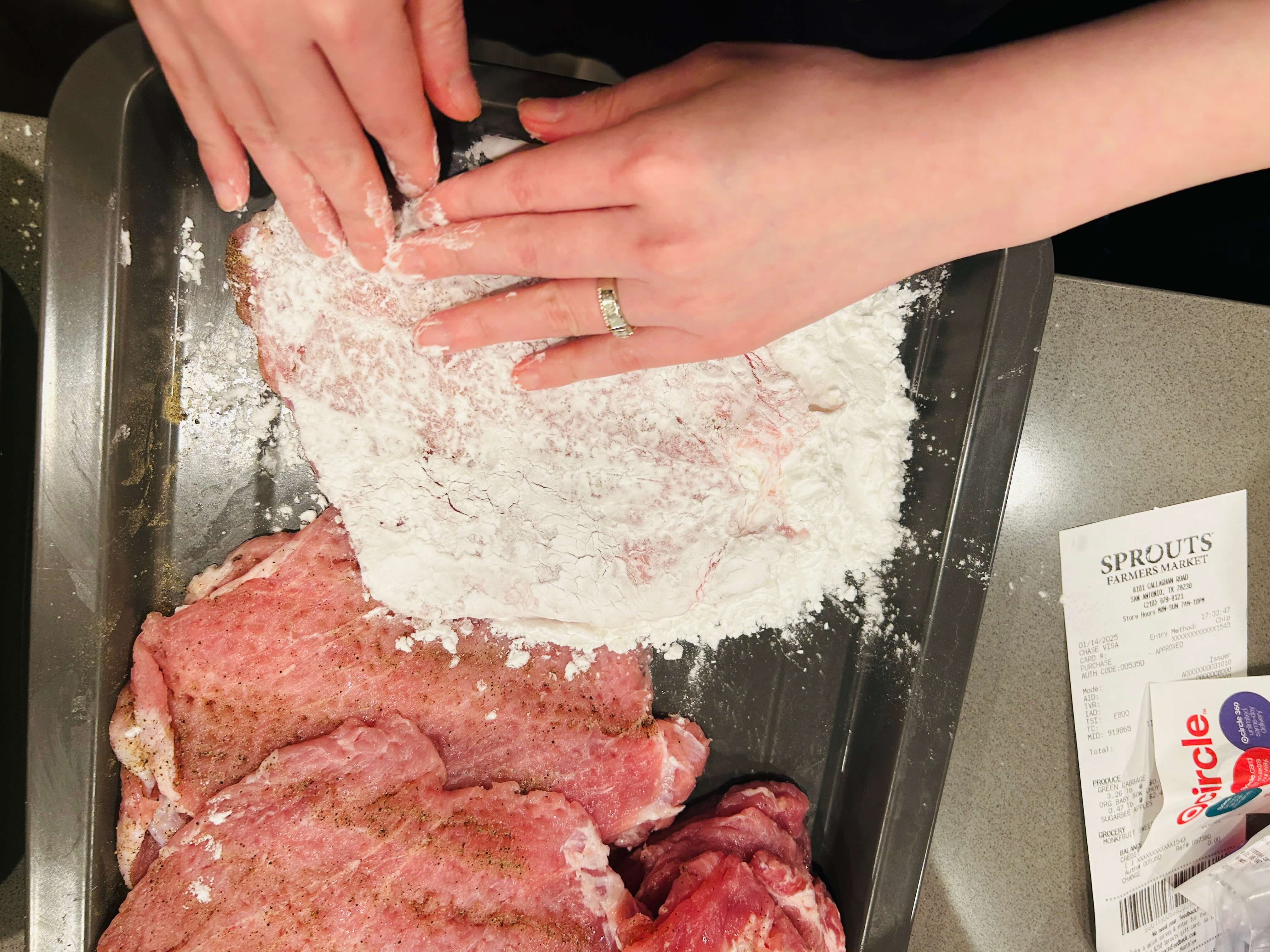 9. 밑간 한 고기 양면에 밀가루 옷을 입혀줍니다.