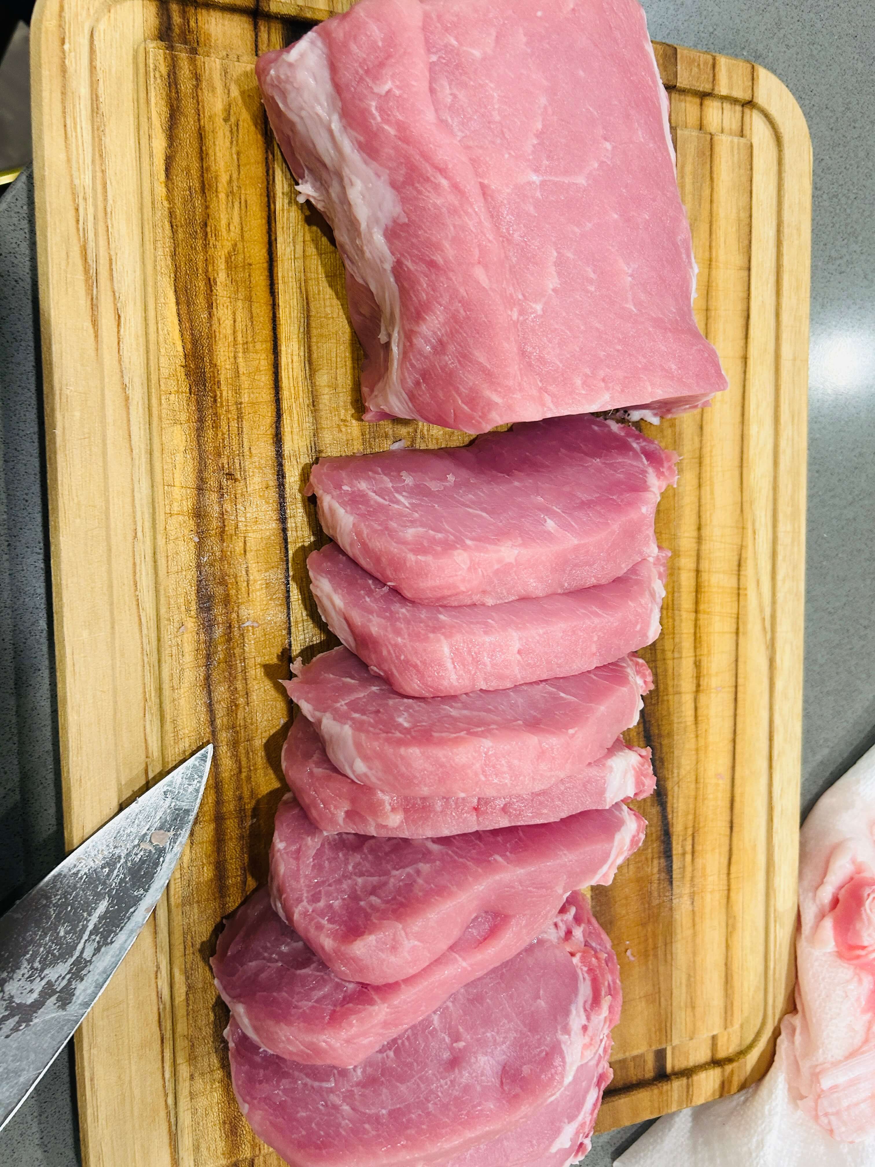 1. 돼지고기 안심을 선호하는 돈가스 두께로 잘라줍니다.