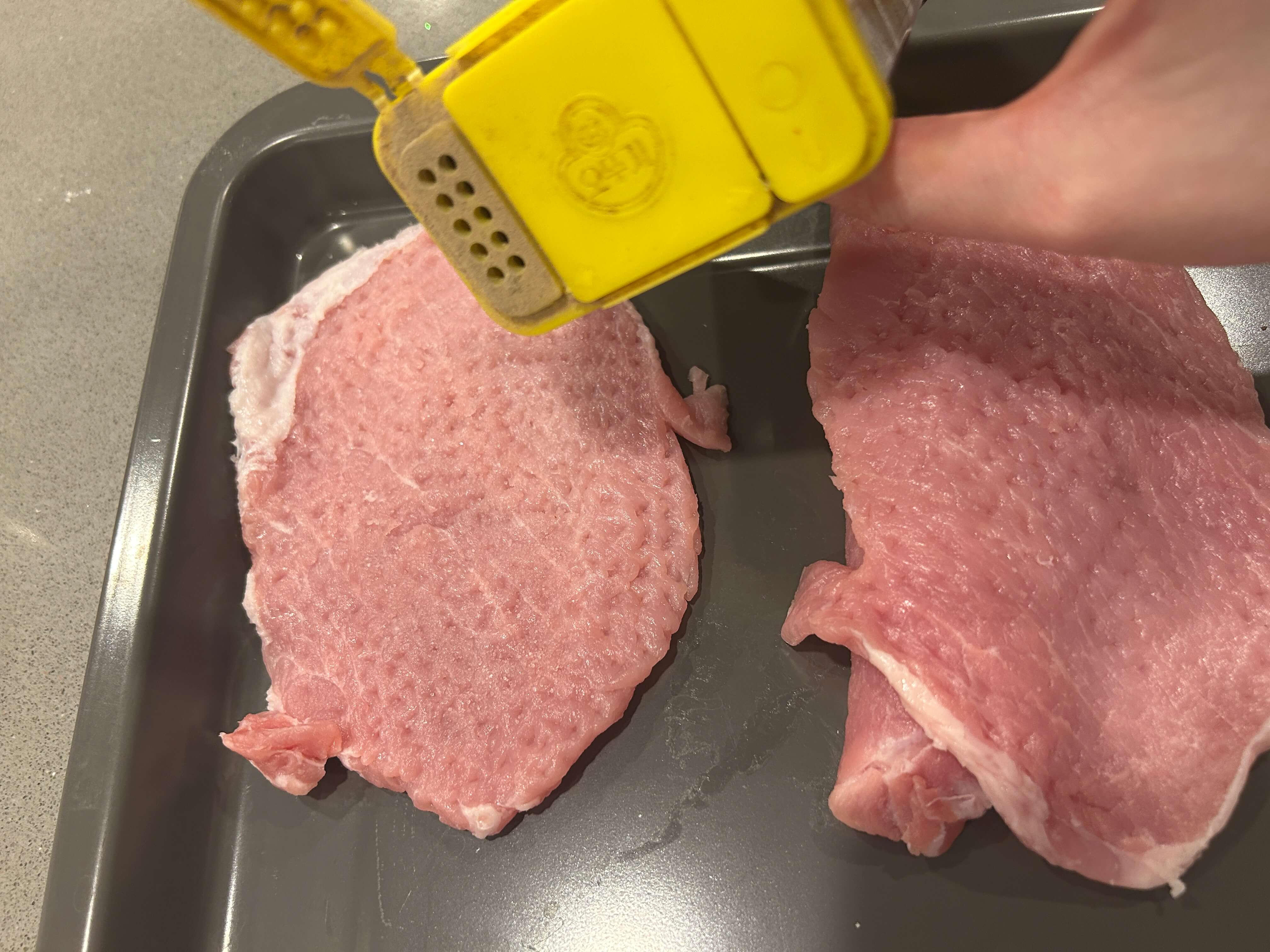 사실 돼지고기 안심은 이렇게 연육망치로 다지지않아고 부드러워서 손으로만 눌러줘도 충분합니다.